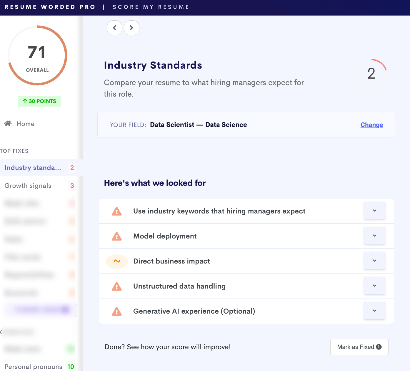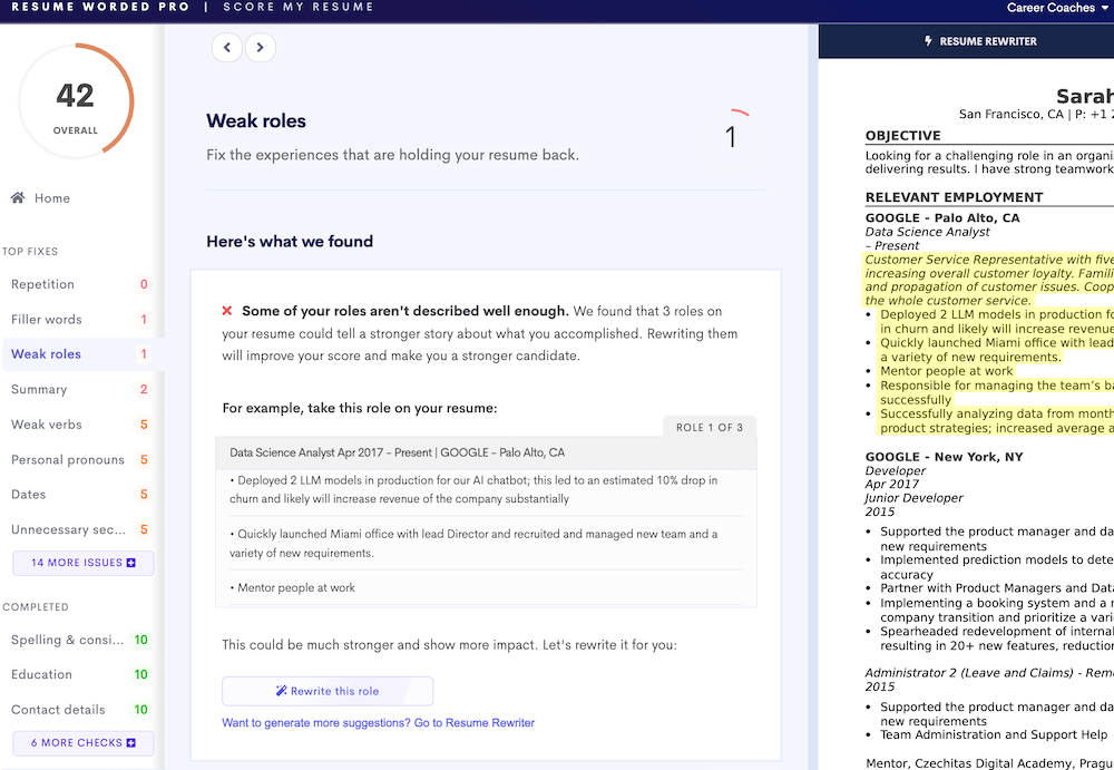 Content that hiring managers care about - Are you showing quantified results with numbers? Does your resume demonstrate career progression? Are you using strong action verbs or passive language?
