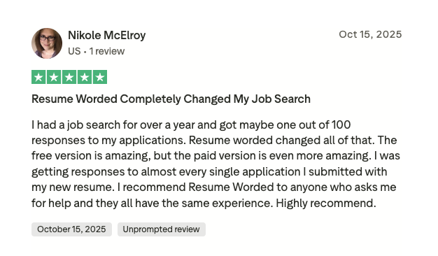 Nikole spent over a year applying to jobs with maybe a 1% response rate - one callback per 100 applications. After using Resume Worded, that changed completely. She started getting responses to almost every single application she submitted. She now recommends Resume Worded to everyone who asks for help, and they all report the same experience.
