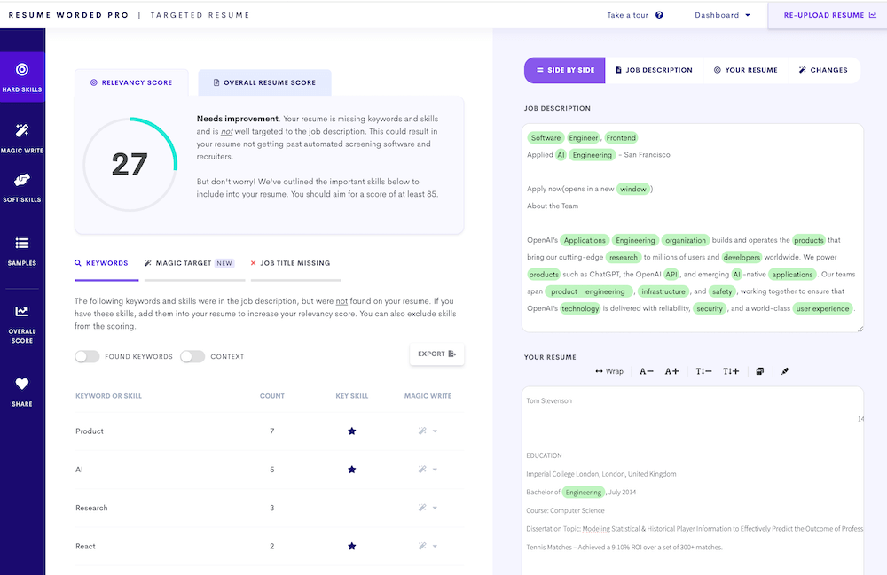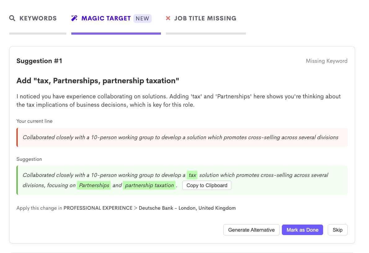 Resume Worded's Magic Target feature within it goes beyond "add these keywords" - it analyzes your experience and shows you how to reframe specific bullets for each role.