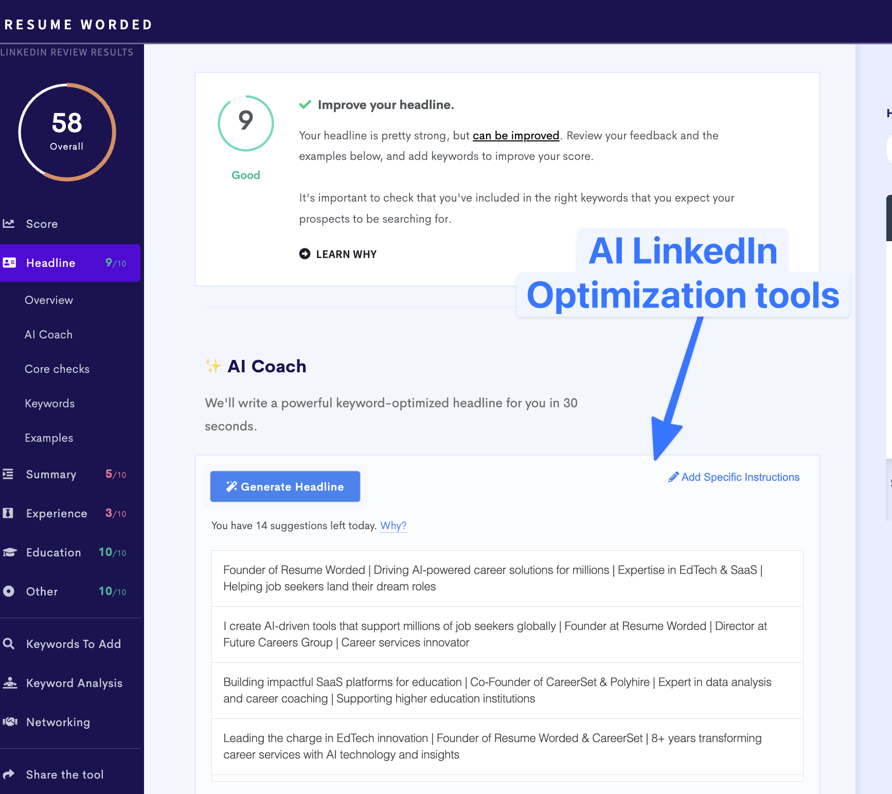 Resume Worded: AI writing features generate optimized content. Analyzes overall profile strength for recruiter searches.