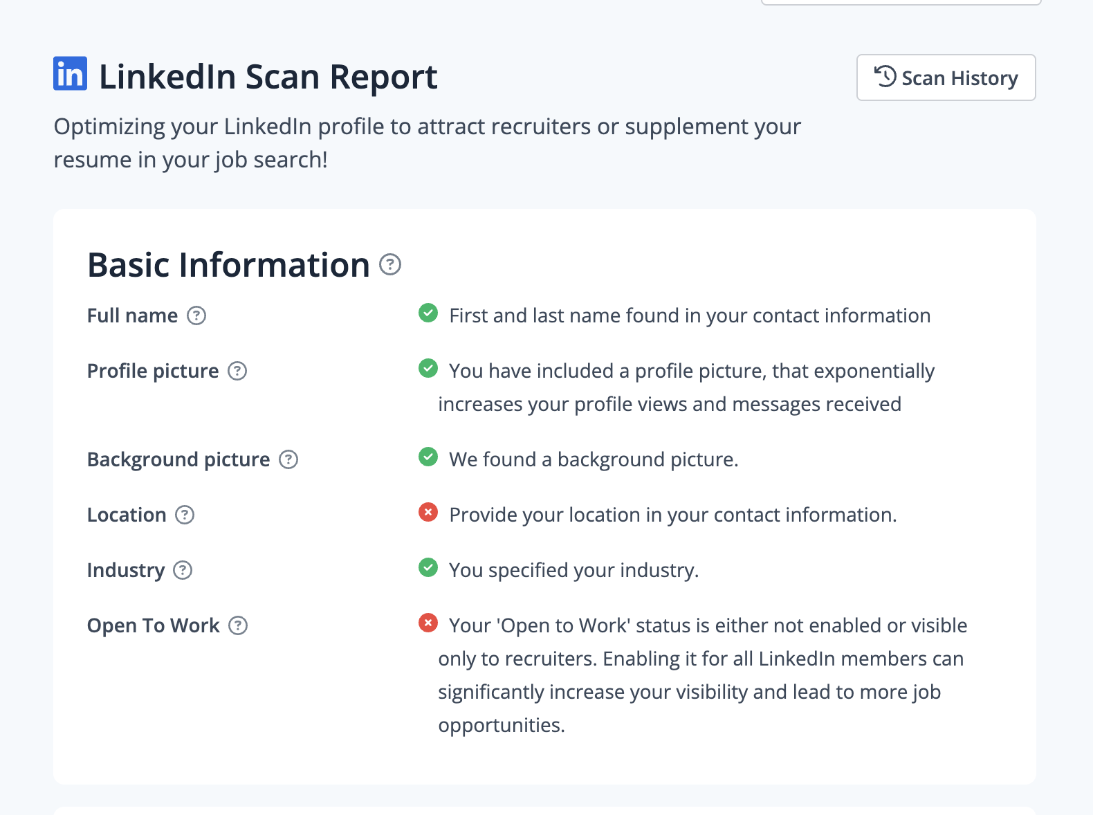 It catches issues that hurt your visibility: weak headlines without searchable keywords, summaries missing key skills, incomplete sections, experience descriptions lacking metrics.