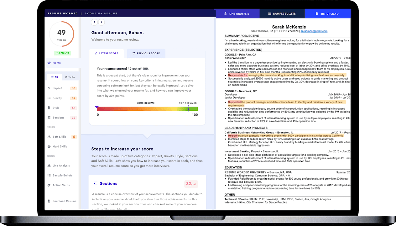 Content that hiring managers care about - Are you showing quantified results with numbers? Does your resume demonstrate career progression? Are you using strong action verbs or passive language?