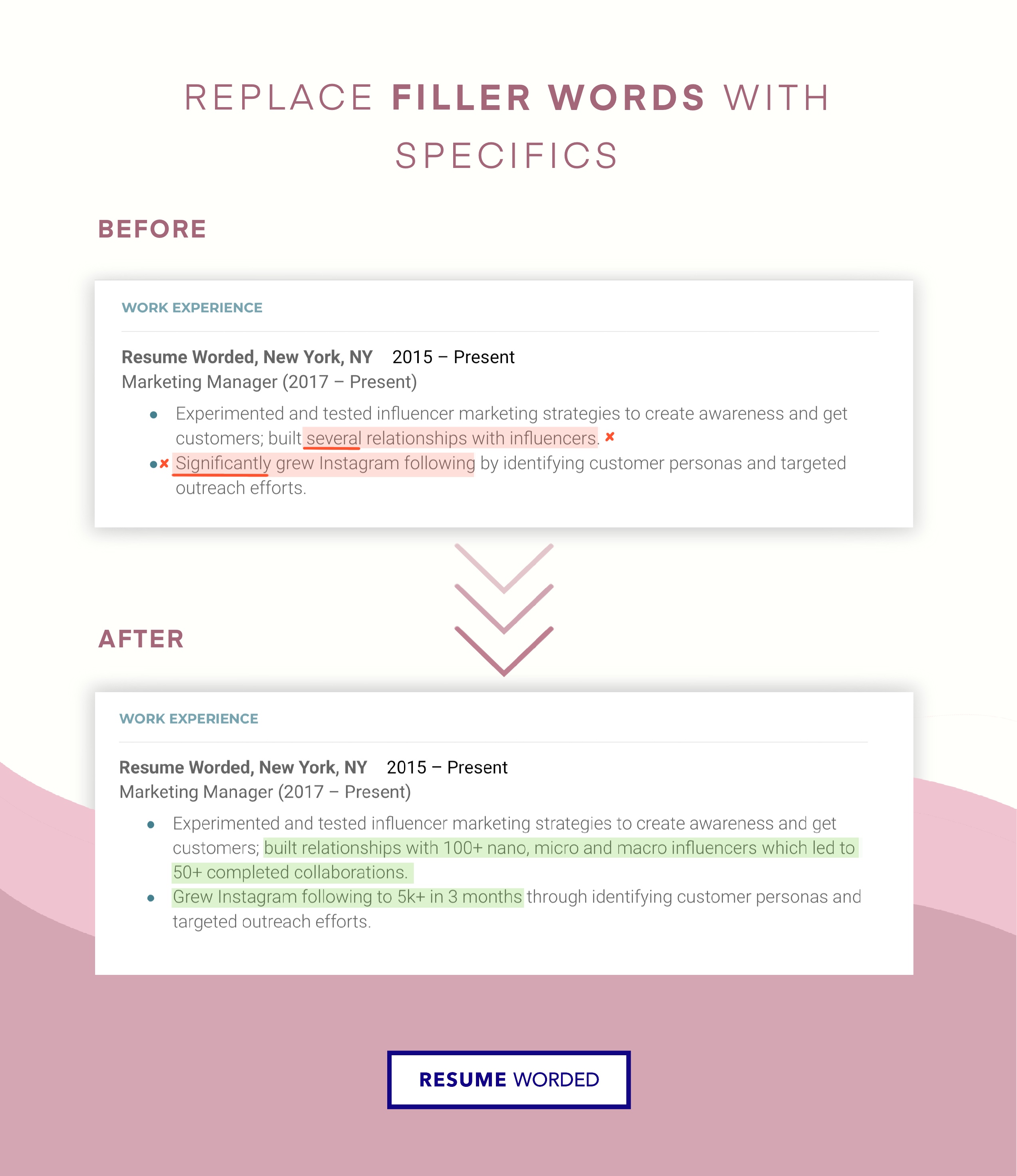 - Transferable skills. Applying for jobs in marketing but don’t have any previous experience? Emphasize roles that allowed you to demonstrate creativity, communication, and problem solving skills.
