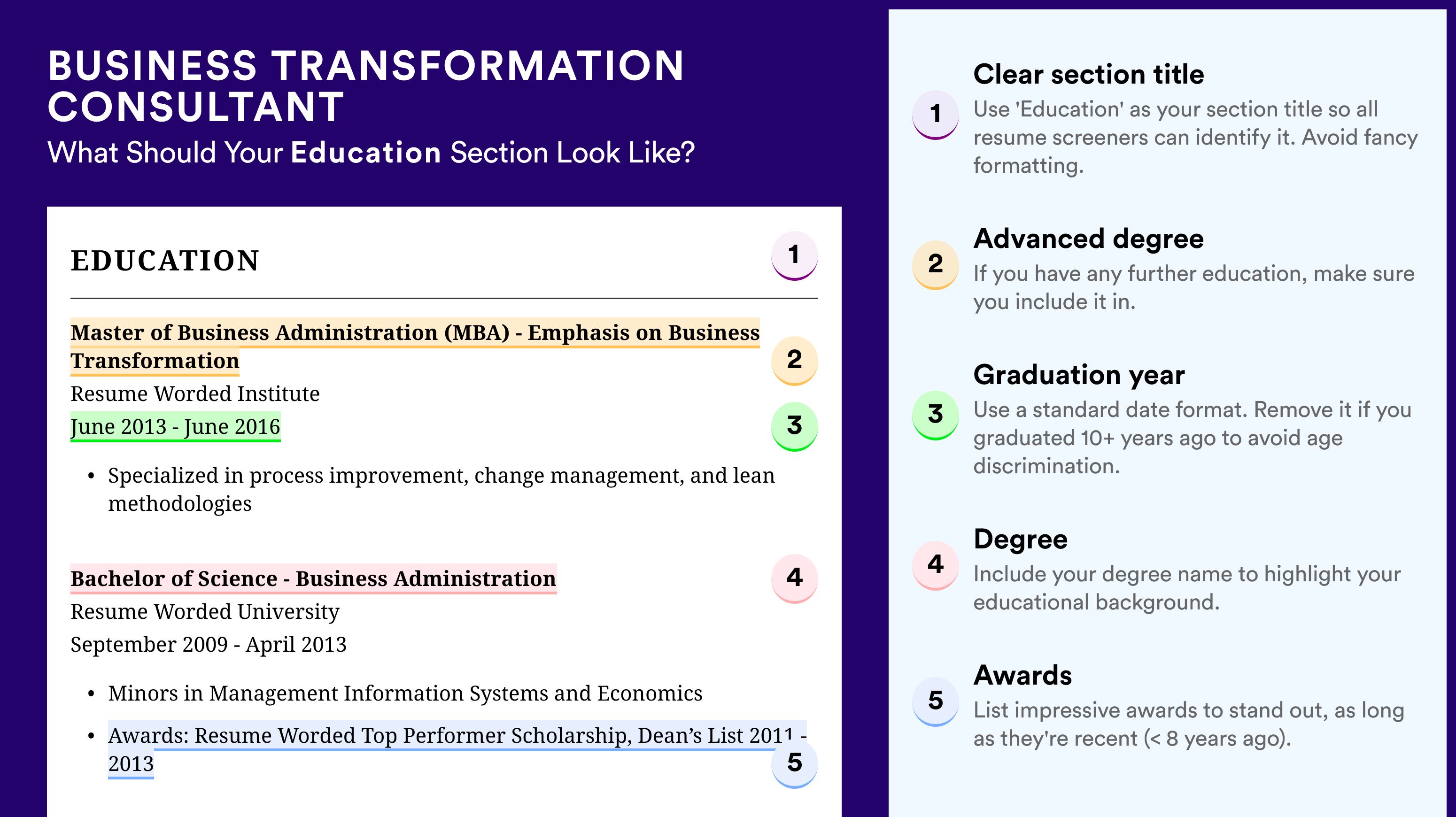 Show the recruiter your dedication to the field by including any certifications you may have gained. These certifications also indicate your increased competence and ability. Both will impress recruiters. This applicant has certification in process improvement and business analysis.