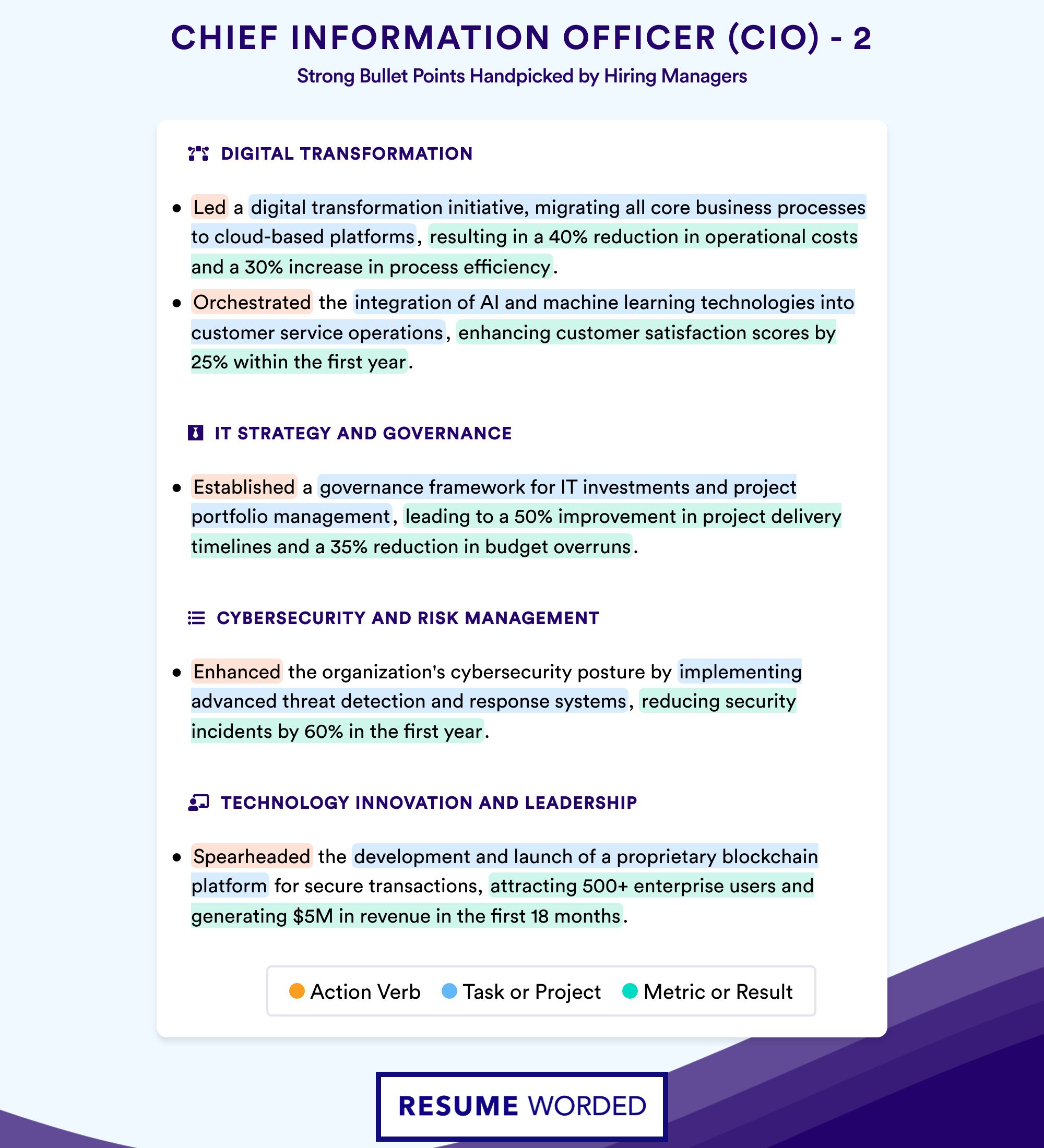 In your resume, emphasize your experience in steering IT planning and implementing technological strategies that align with overall business goals. This demonstrates your ability to work cross-functionally, which is essential for a CIO.