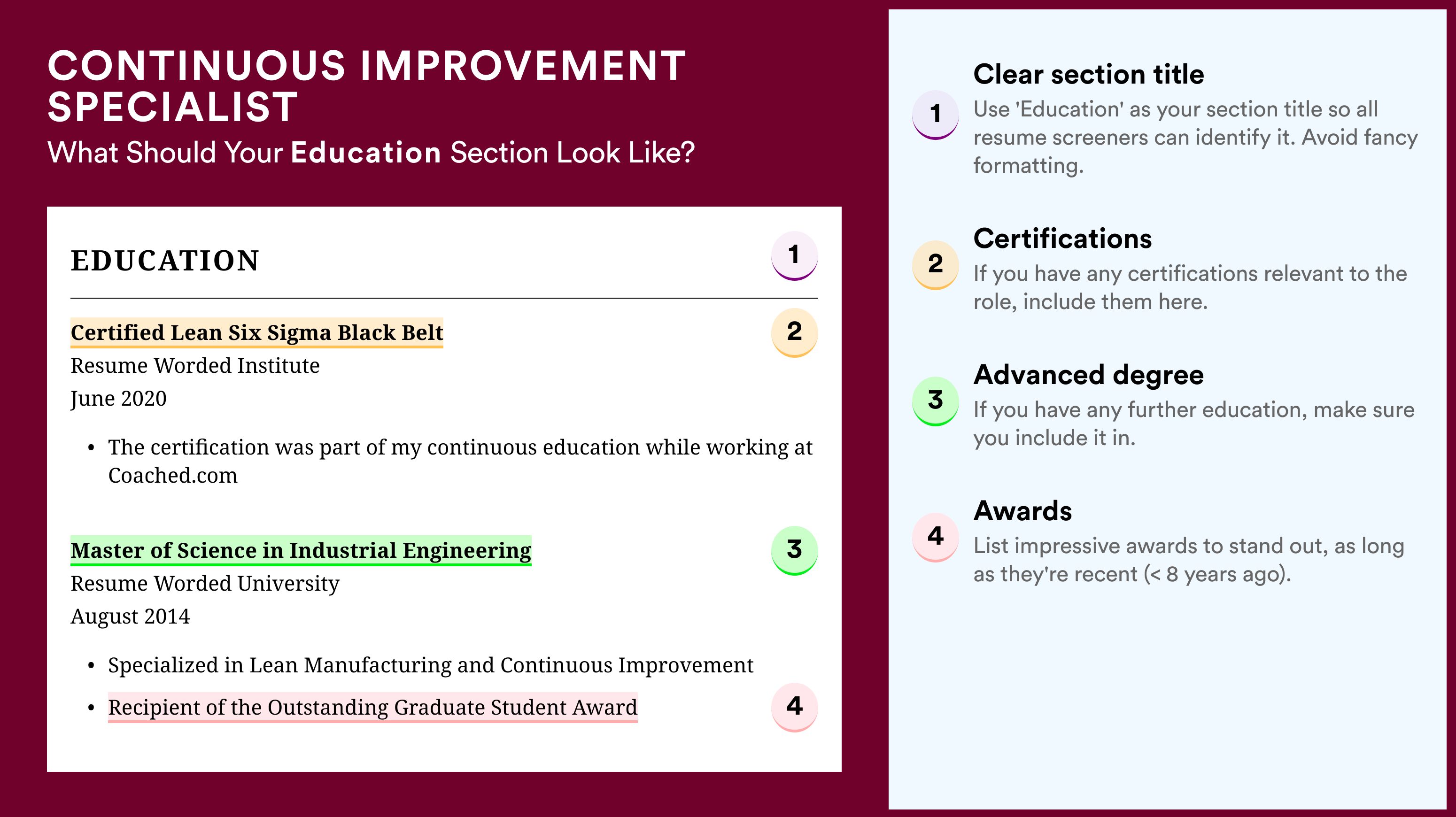Certifications show recruiters that you are passionate about your profession and are willing to go the extra mile to improve your skill set. That drive and effort are very impressive to recruiters so if you have any continuous improvement-related certifications like this applicant has, make sure you include them in your resume.