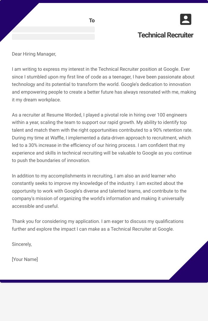I'm reaching out to express my enthusiasm for the Technical Recruiter position at Google. My journey into the tech world started in the most unexpected place - a small, dusty library in my hometown, where I stumbled upon a book about the transformative power of technology. That moment ignited a spark in me that has grown into a roaring fire. I've always admired how Google has been at the forefront of innovation, not just by creating cutting-edge products but by cultivating an environment where technology and humanity intersect seamlessly.