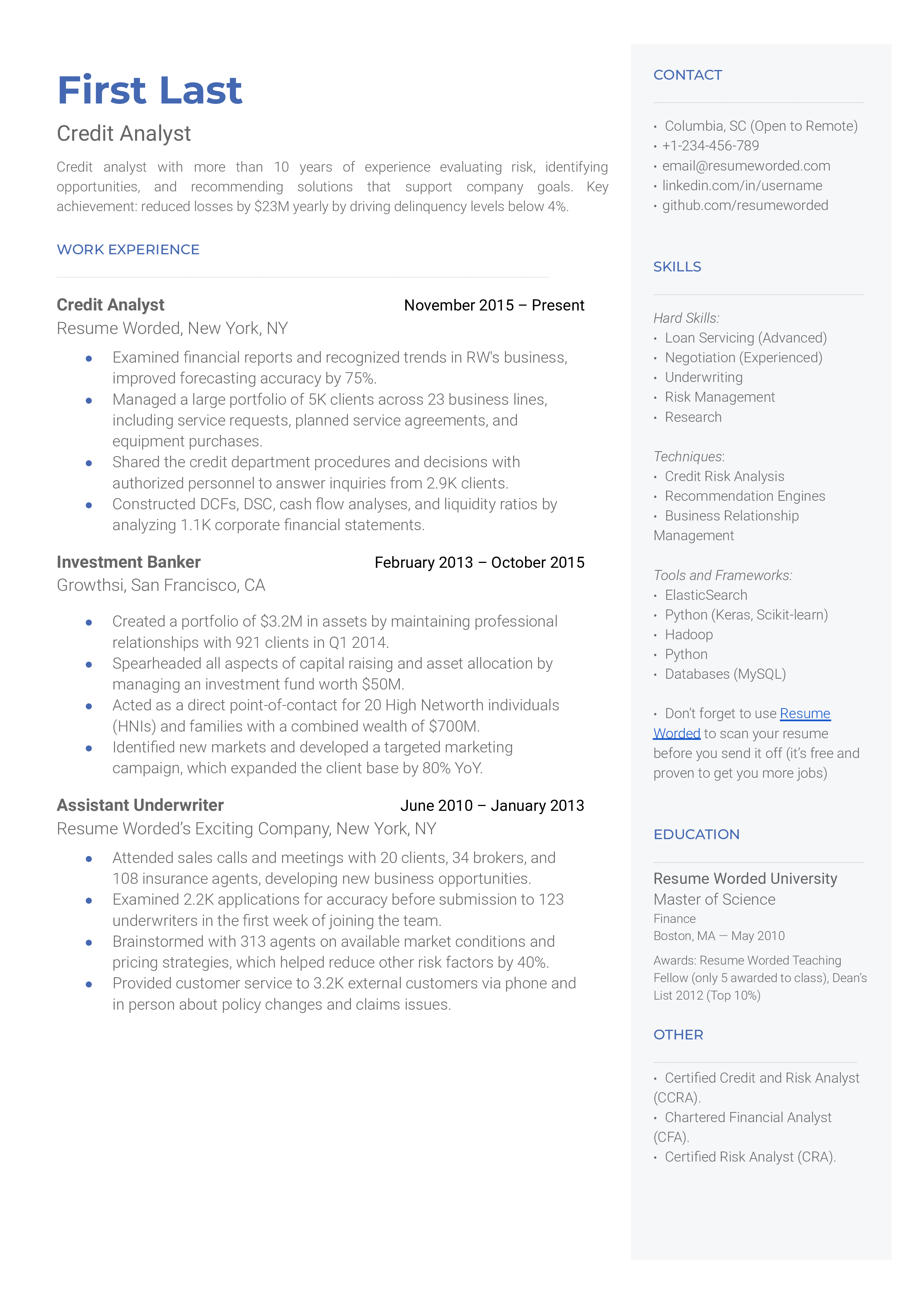 Financial certifications help you validate your skills and experience as a credit analyst, so you should always include them if you have any. Some of the most relevant ones are: -Credit risk certification (CRC). -Credit business associate (CBA). -Certified credit executive (CCE). -Certified risk analyst (CRA).