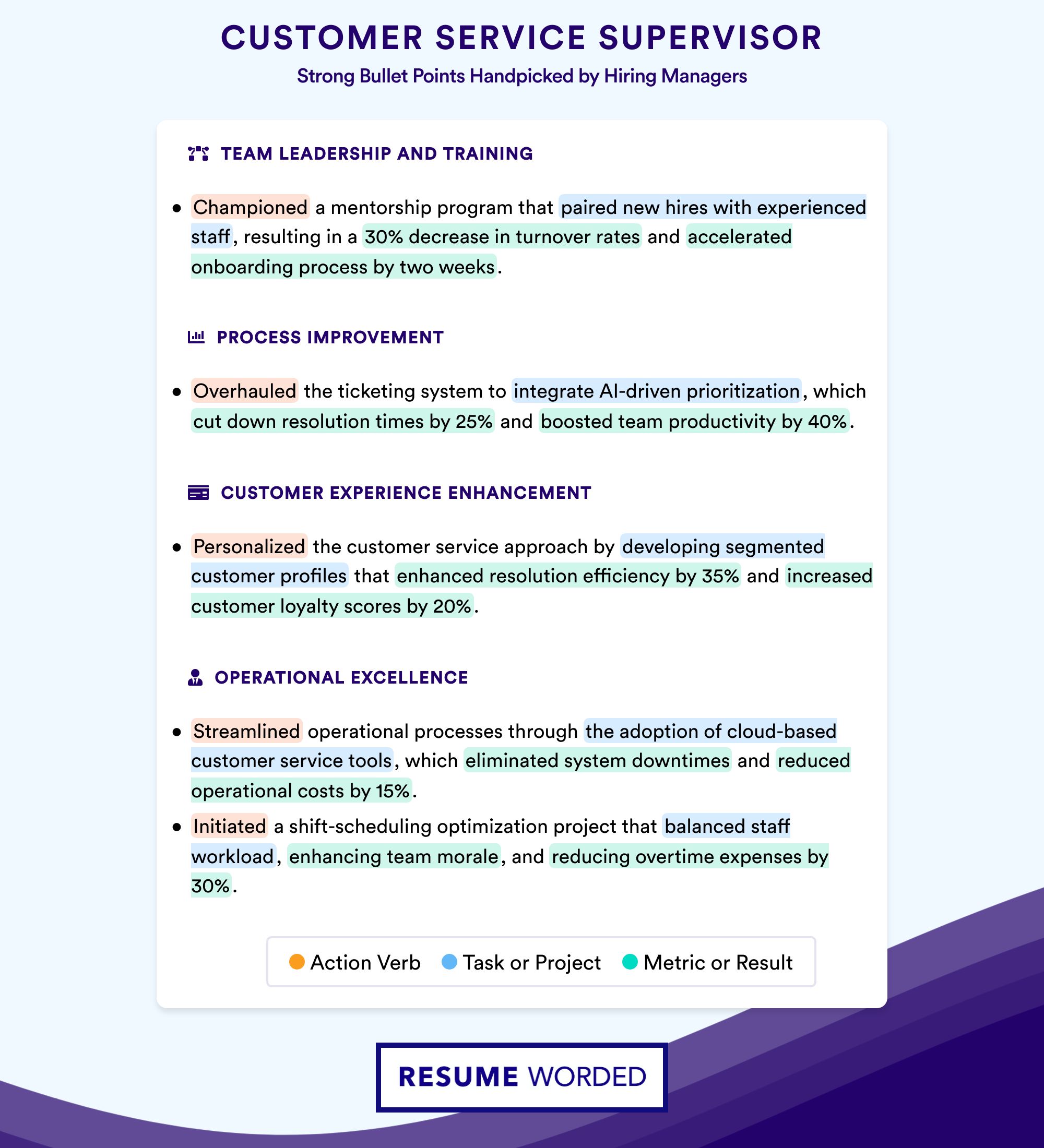 Since customer service supervisors are responsible for overseeing day-to-day productivity of the customer service team, it’s important that they are able to identify areas for growth and improve employee performance quickly. Any and all experience you have teaching, mentoring, or training others should be outlined on your resume.