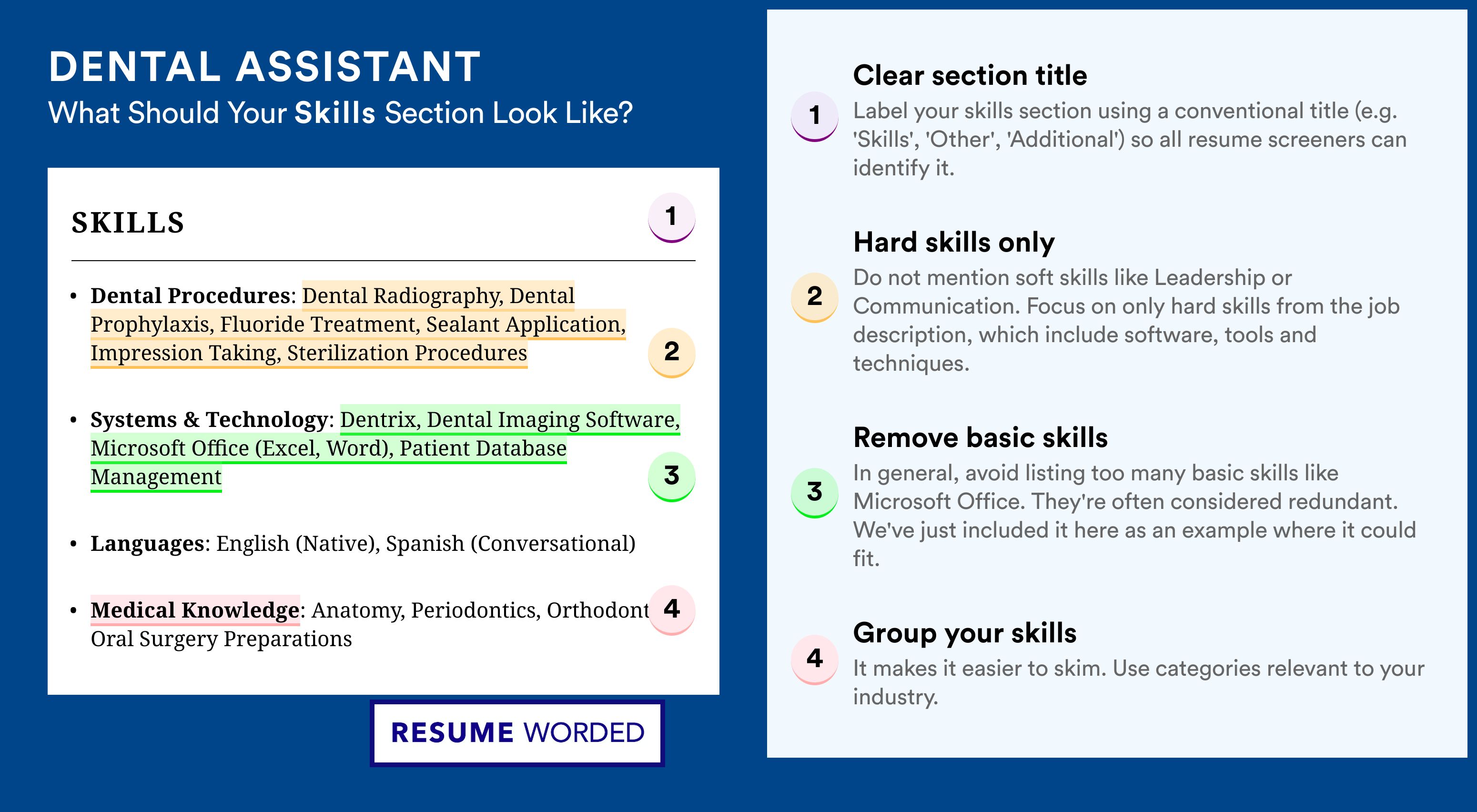 Since dental assistants frequently interact with patients, it's crucial to emphasize your communication and interpersonal skills. Highlight any experience that demonstrates your ability to provide comfort and reassurance to patients, manage patient flow, and maintain a clean and organized workspace.