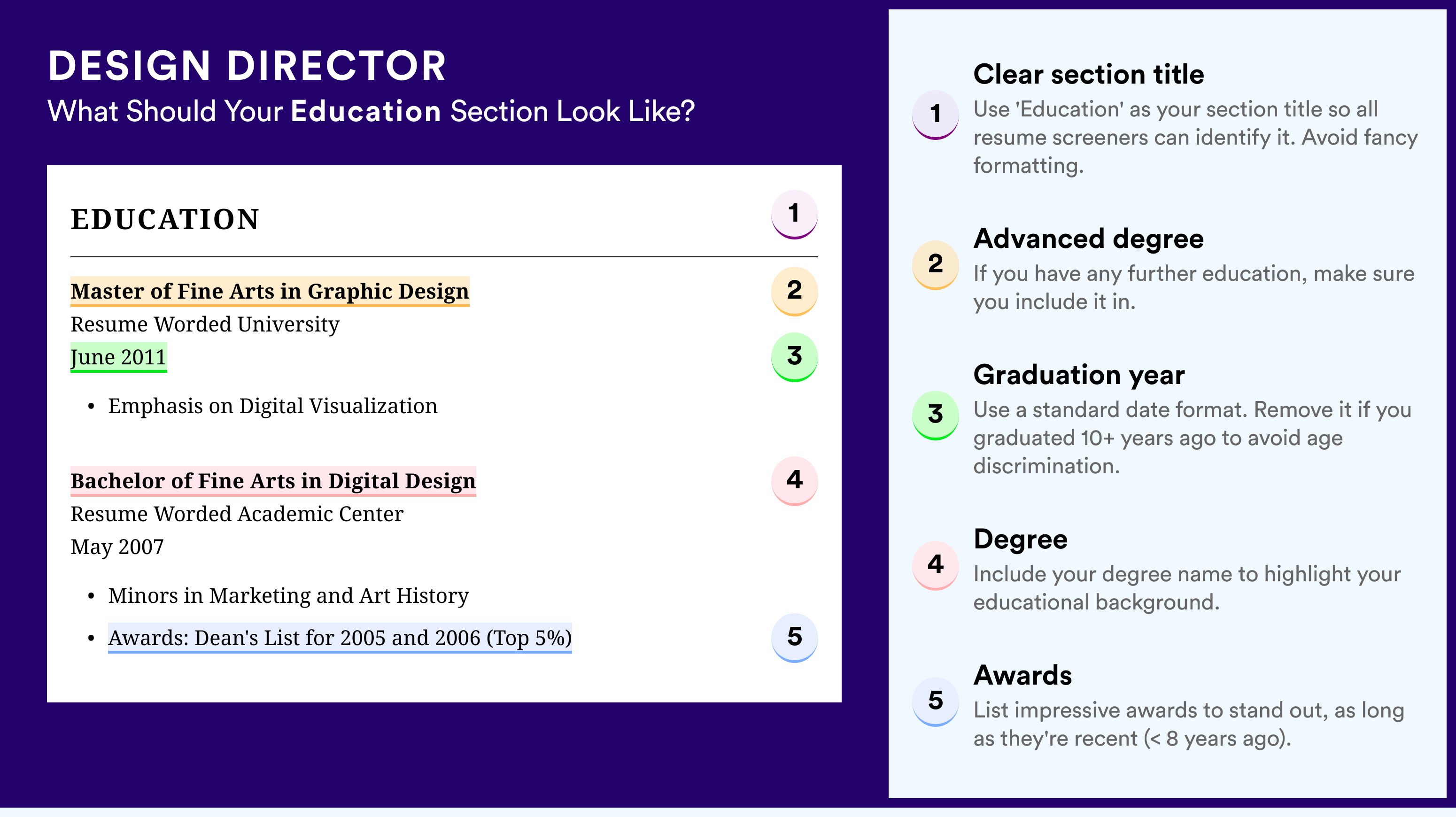 Although the design director may wear many hats within a company, the most important skill for a design director to have is the ability to create inspiring and innovative visuals. Compiling your previous projects and putting them in a portfolio can be really helpful to show potential employers what you are capable of. As long as you have permission from previous employers and/or clients to share your work, it’s wise to send in a creative portfolio alongside your resume for the role.