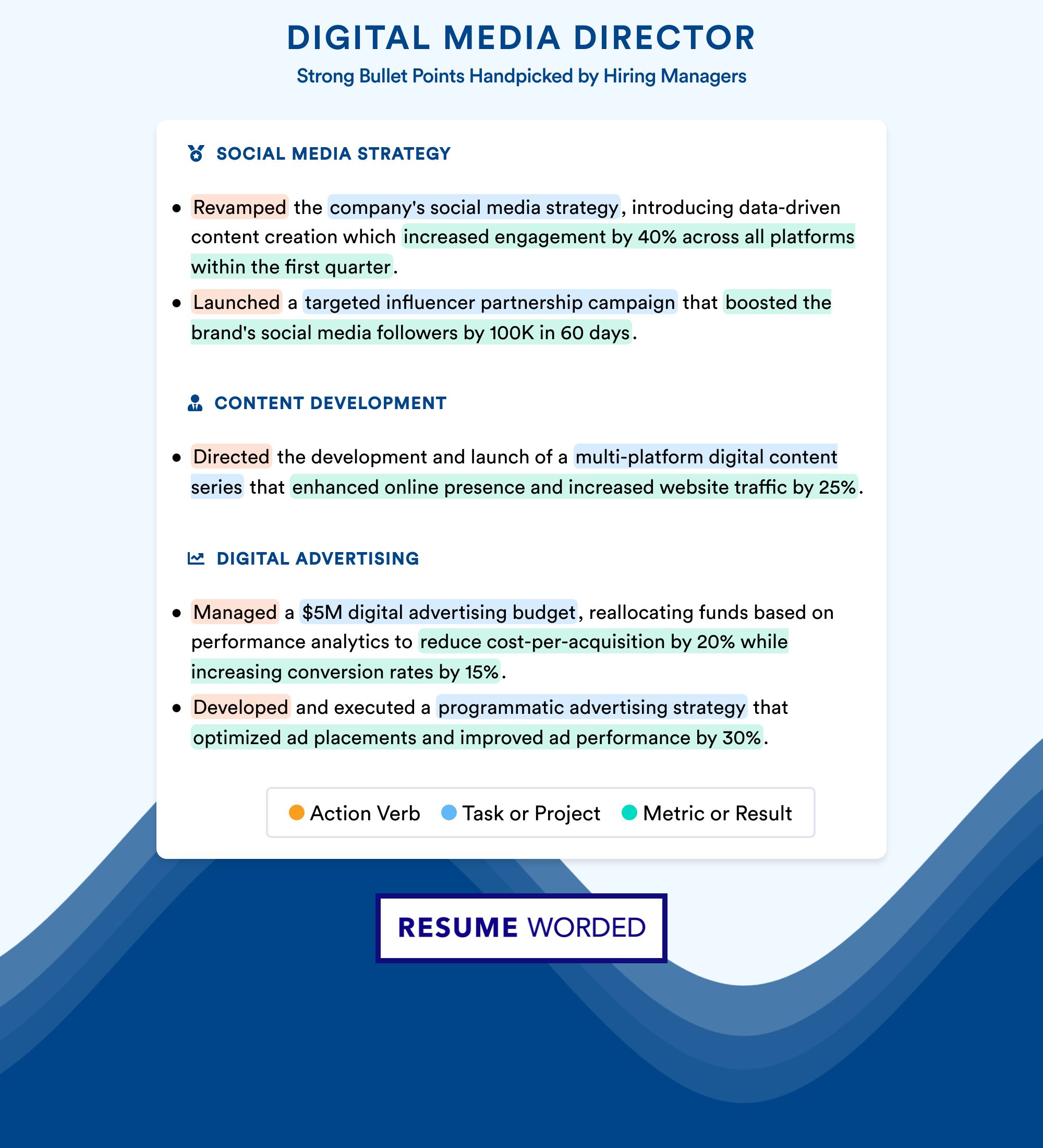 The digital media director is responsible for effective management and collaboration within their department, but the need for teamwork skills doesn’t end there. Digital media directors need to build relationships with outside advertising agencies, media outlets, and PR firms to set up strategic media opportunities for the company. Candidates who have experience building effective relationships with third-party agencies, freelancers, and vendors should highlight this skill on their resume.