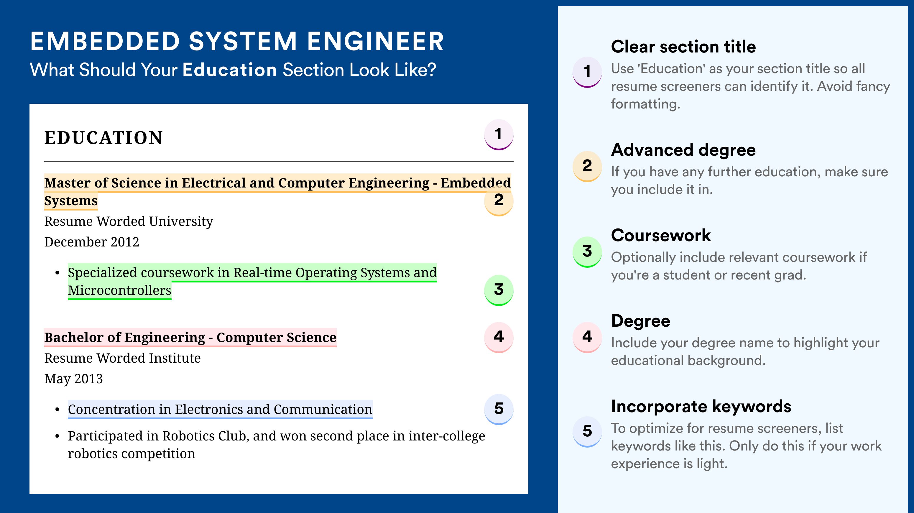 In your embedded system engineer resume, you can talk about the programming languages and frameworks you’re familiar with. Some of the embedded systems' most popular coding languages are Java, Python, C++, and C.