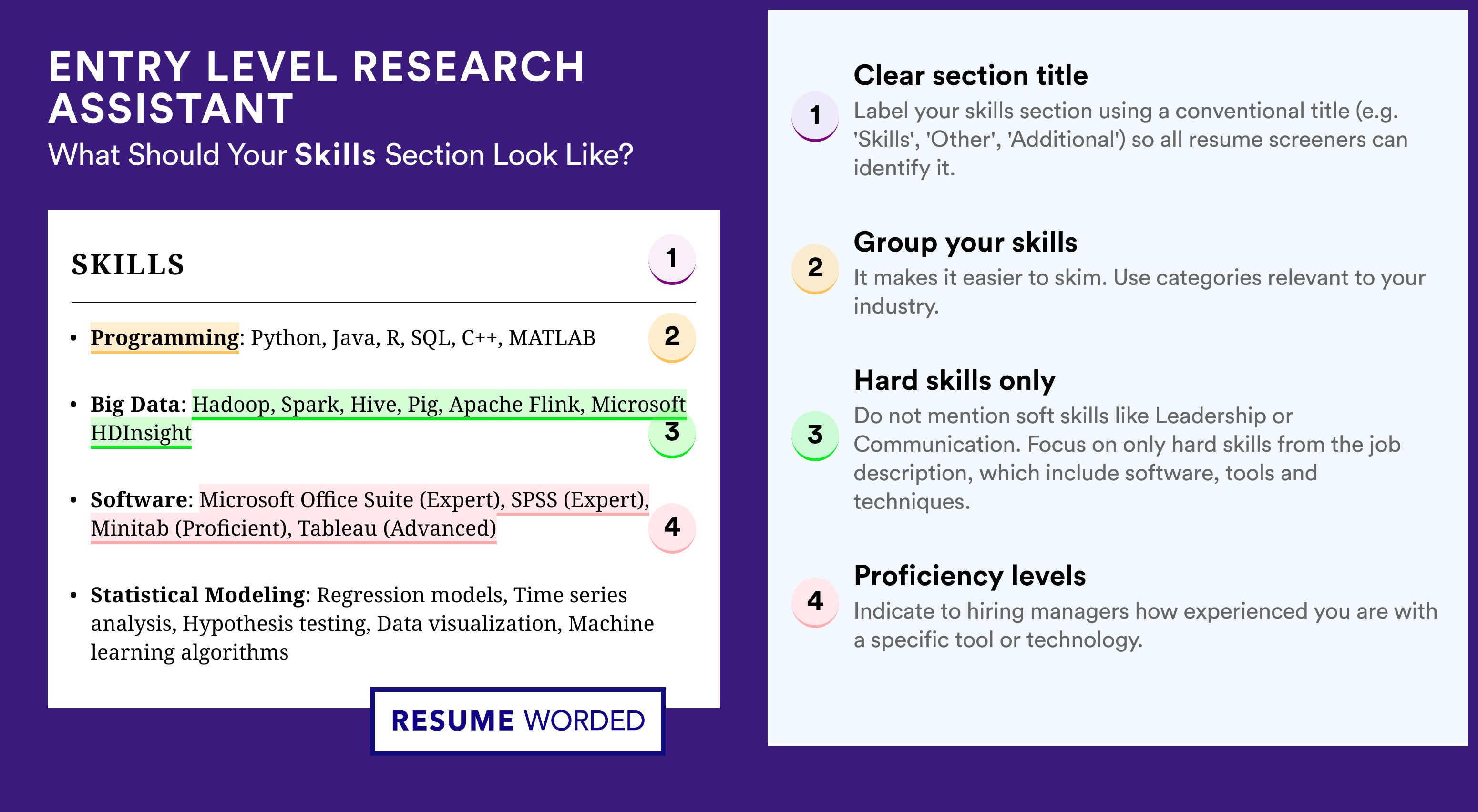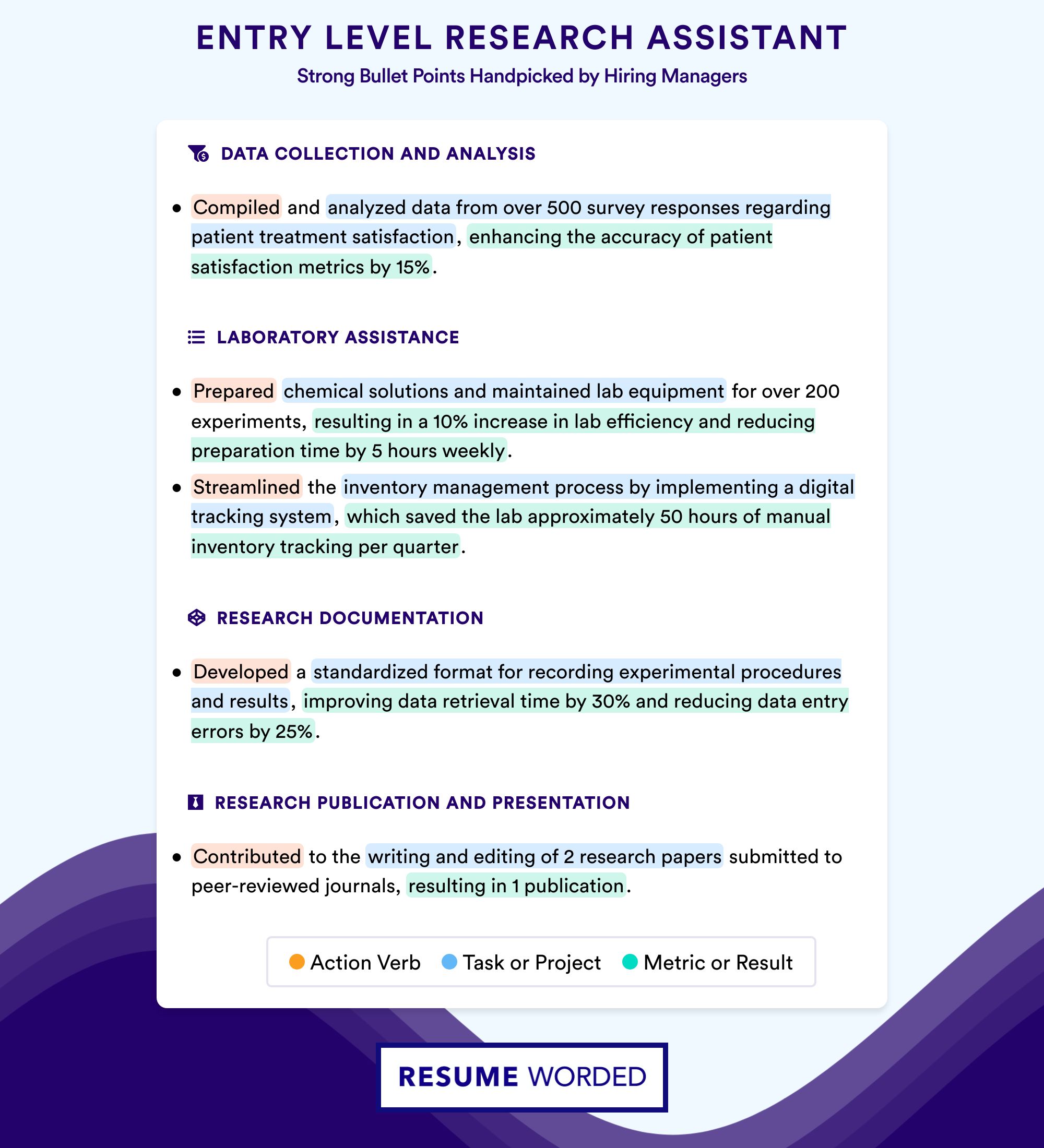 To get an entry level research assistant role, it will help if you are familiar with the area of study the lab is focused on. For example, if you know the lab you are applying to mainly studies genetics, you will want to include any relevant educational or research experience you’ve had in the field. This could be academic or past job experience. Showing you are well versed in the area of study you’ll be researching will make you more credible to hiring managers.