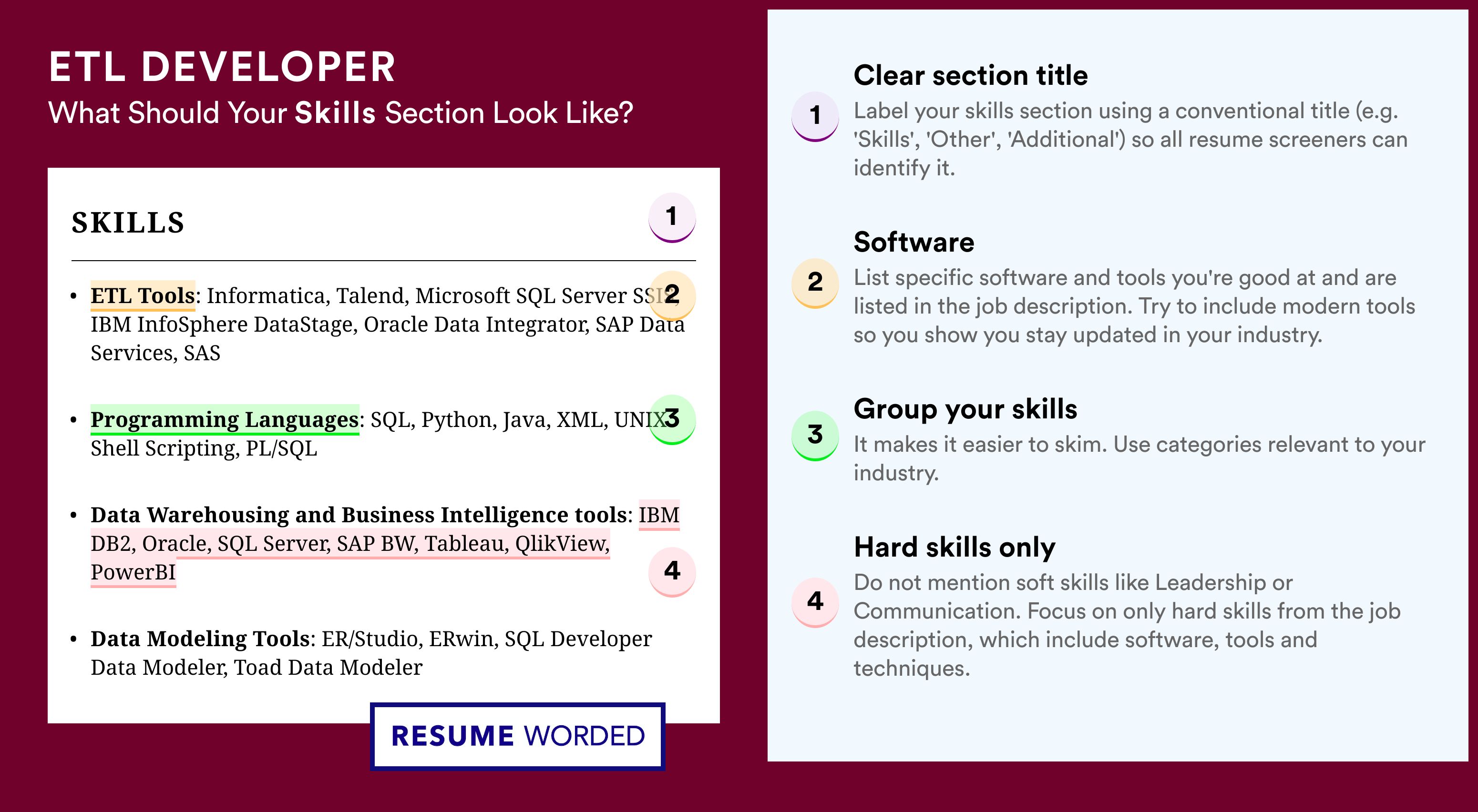 These days we have ready-made automation tools used for ETL processes. They streamline the entire operations and help ETL developers move data between sources. An ETL developer must integrate these tools to ensure that data is usable. Therefore, you should include your knowledge of tools like Talend, Informatica, or Pentaho in your resume.