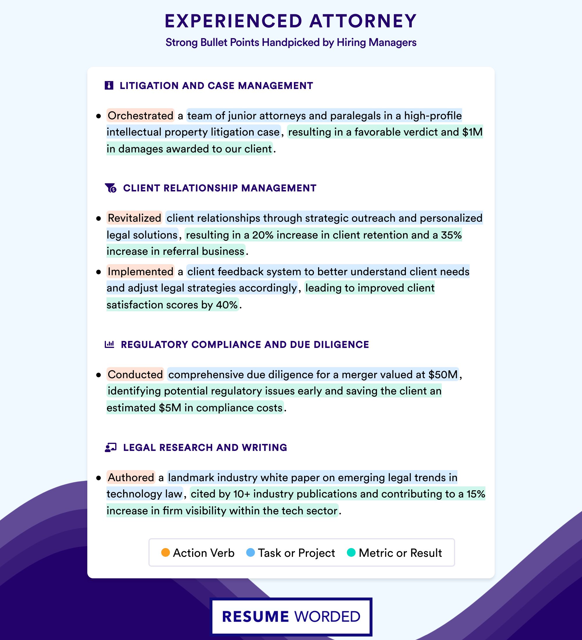Over your career, you've likely specialized in certain areas of law. Whether it's corporate, family, criminal, or intellectual property law, you should highlight your specialty and illustrate your achievements in that area. This will show potential employers your depth of knowledge and your capacity to handle specific legal cases.