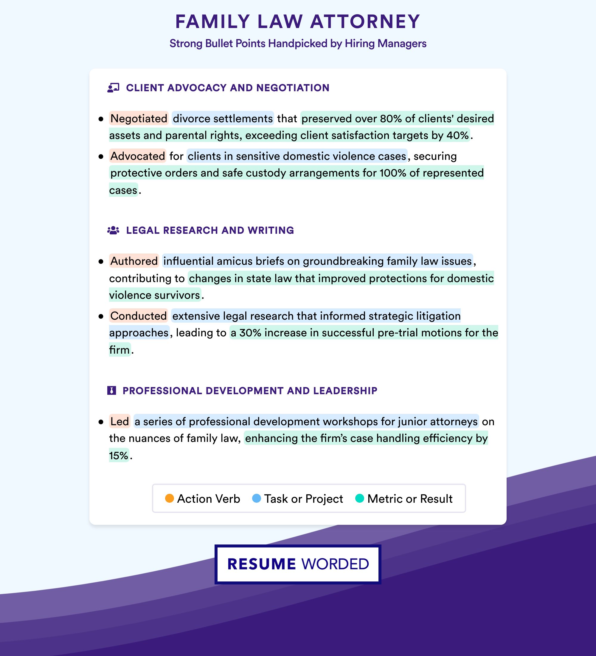 Family lawyers are skilled in many areas of general law. But for your family attorney resume, concentrate on listing the skills that are directly related to family law like alimony, child support, or divorce.