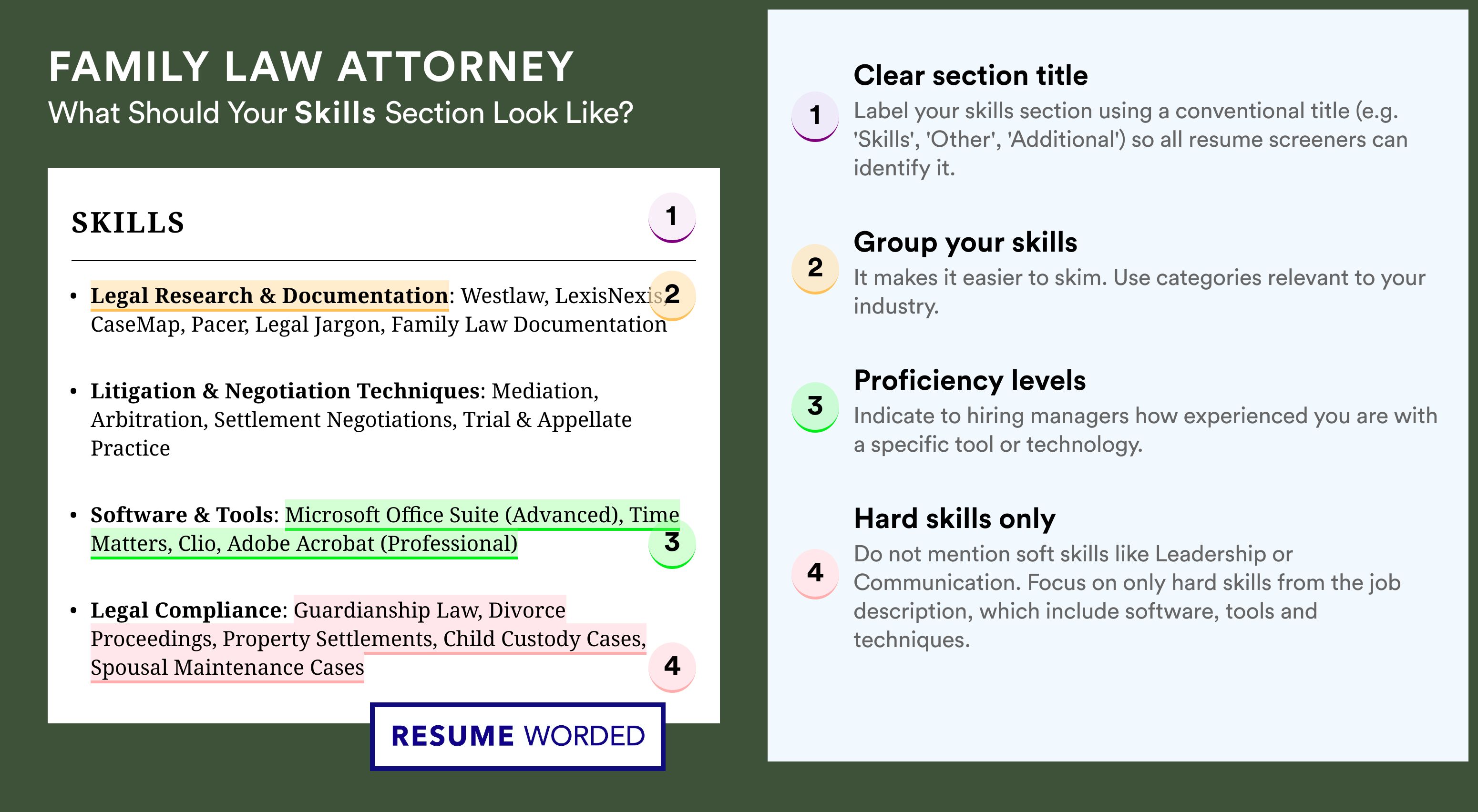 Focus your skill section on family law skills.