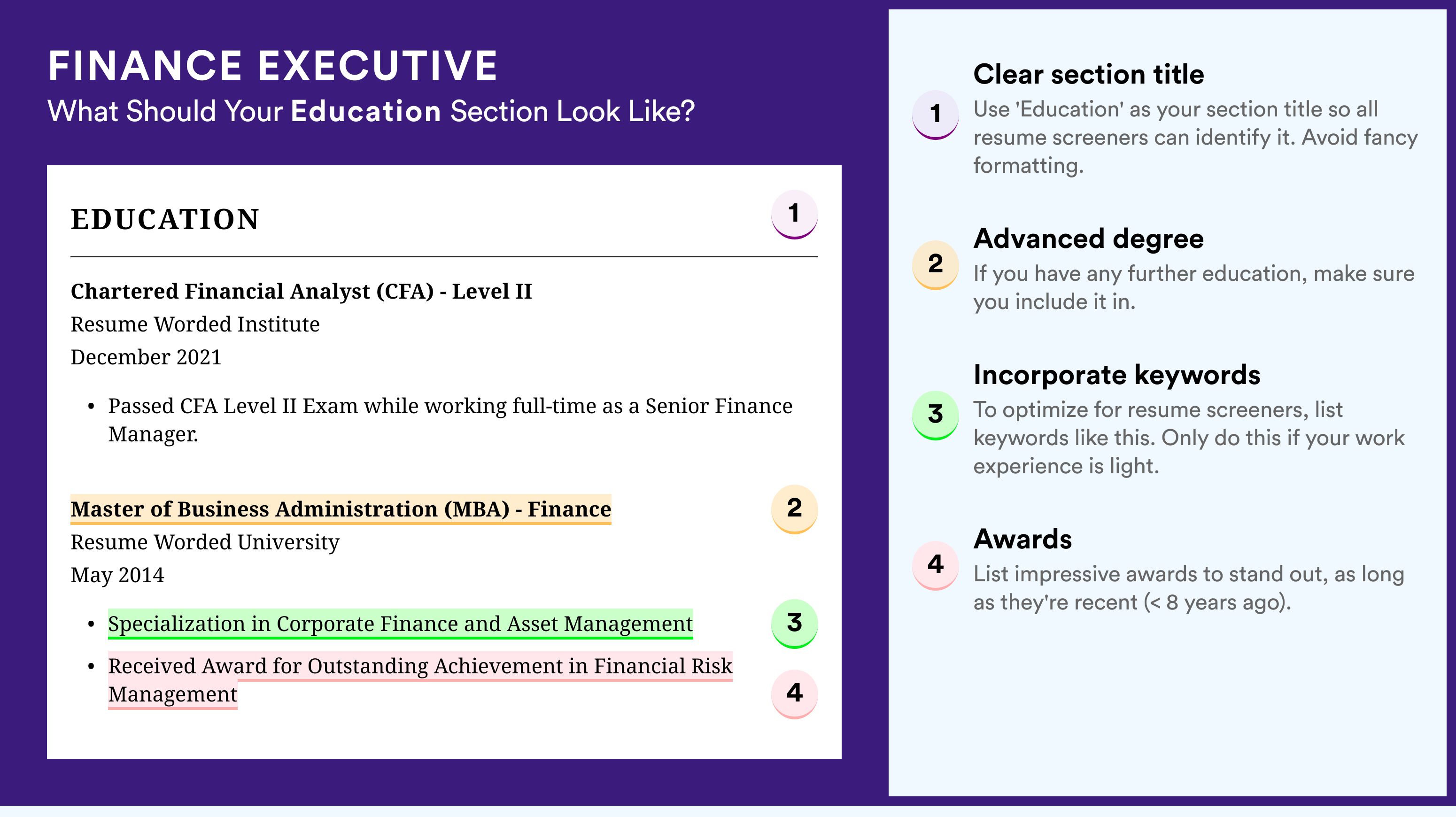 Recruiters want to understand your career path and how you got to the senior position of a finance executive so ensure your experience section shows your career growth clearly. Consistent promotions also indicate to recruiters that you are an exemplary and successful employee.