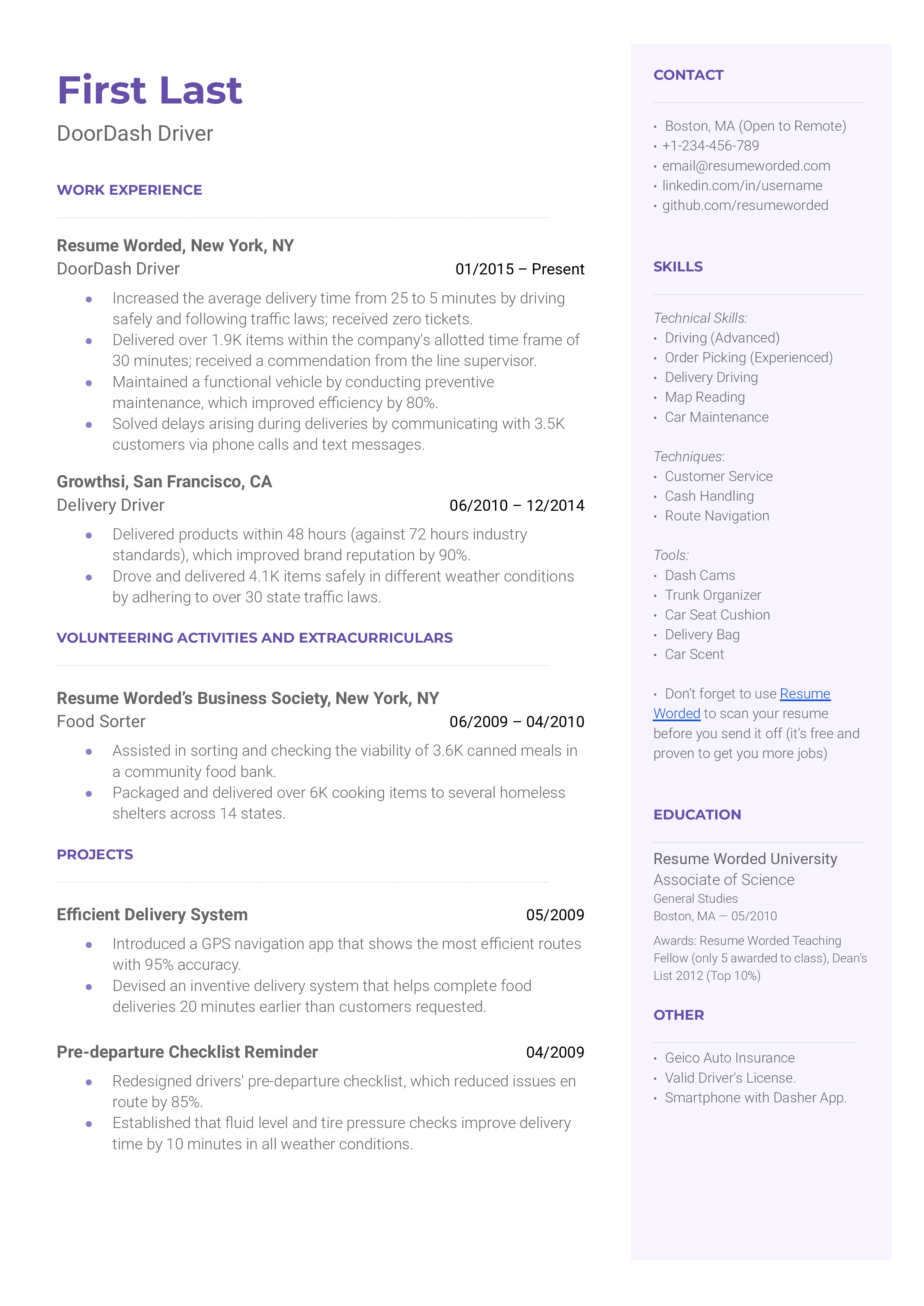 As a delivery driver, you are the face of the delivery app. As such, a company wants to know that they will be represented well and that you will provide excellent service to their customers. Because of this, include any recognition you received for great service and show how efforts you have made have resulted in a better customer experience.