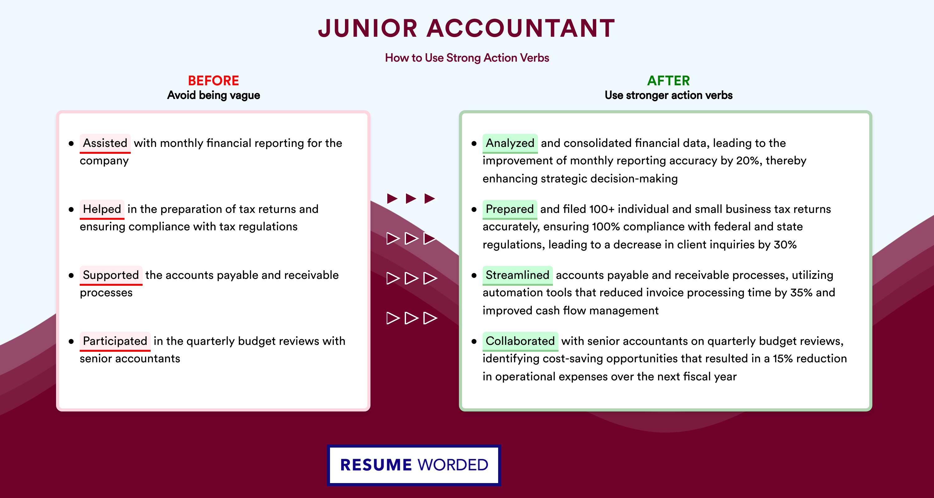 We spoke with hiring managers at top accounting firms like Deloitte, PwC, and KPMG to gather their best tips for writing a standout junior accountant resume. They've seen thousands of resumes throughout their careers and know exactly what separates a good resume from a great one. The following tips incorporate their expert insights to help you craft a resume that will impress recruiters and land you more interviews.