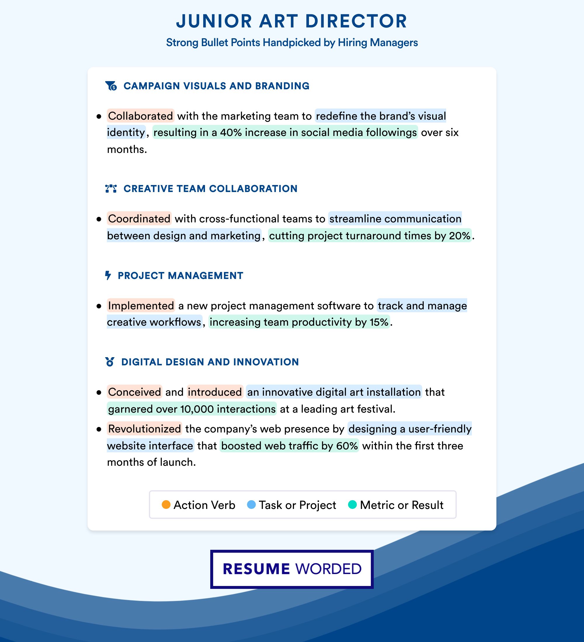 Your work experience section is the heart of your resume. It's where you showcase your most relevant and impactful career achievements as a junior art director. Hiring managers want to see how you've applied your skills in real-world situations and the results you've delivered.