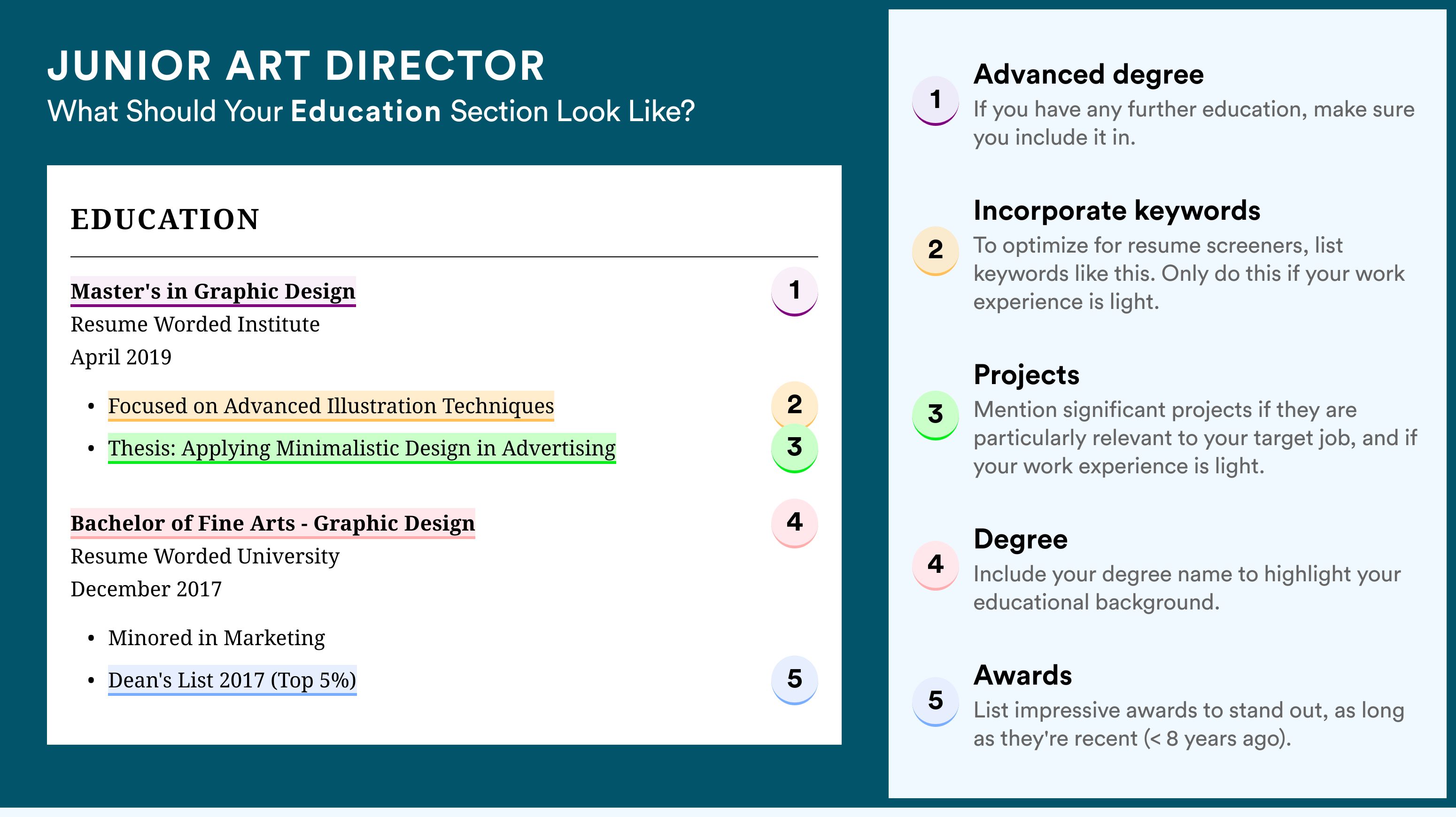 The education section of a resume for a junior art director position should be concise and highlight your relevant academic background. It's important to showcase your degree and any coursework or certifications that demonstrate your skills and knowledge in the field.