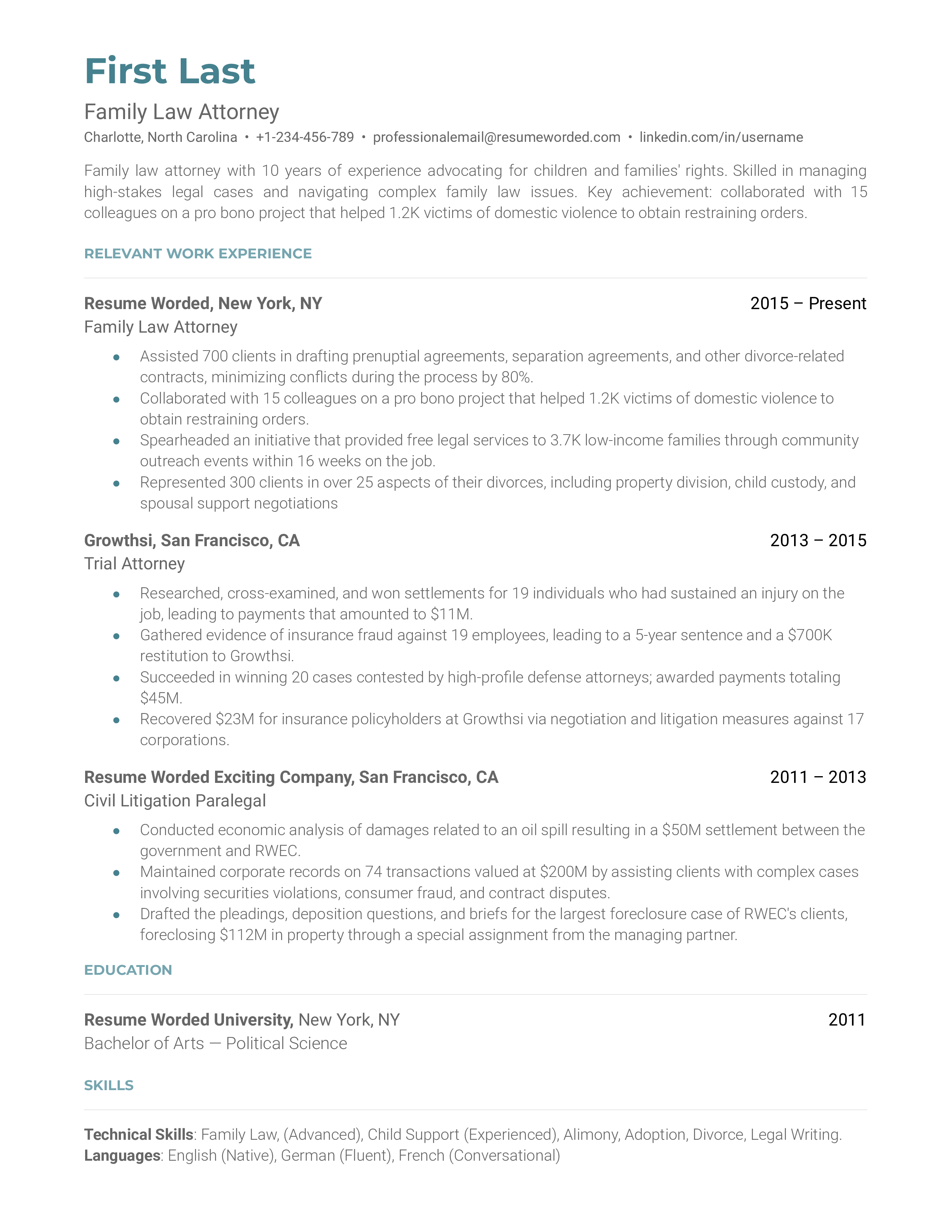 The legal field prioritizes professional communication, so make sure you stress your experience here by including action verbs like "Drafted" or "Presented" — verbs like these show to recruiters that you have strong communication skills, skills that are essential in the legal industry.