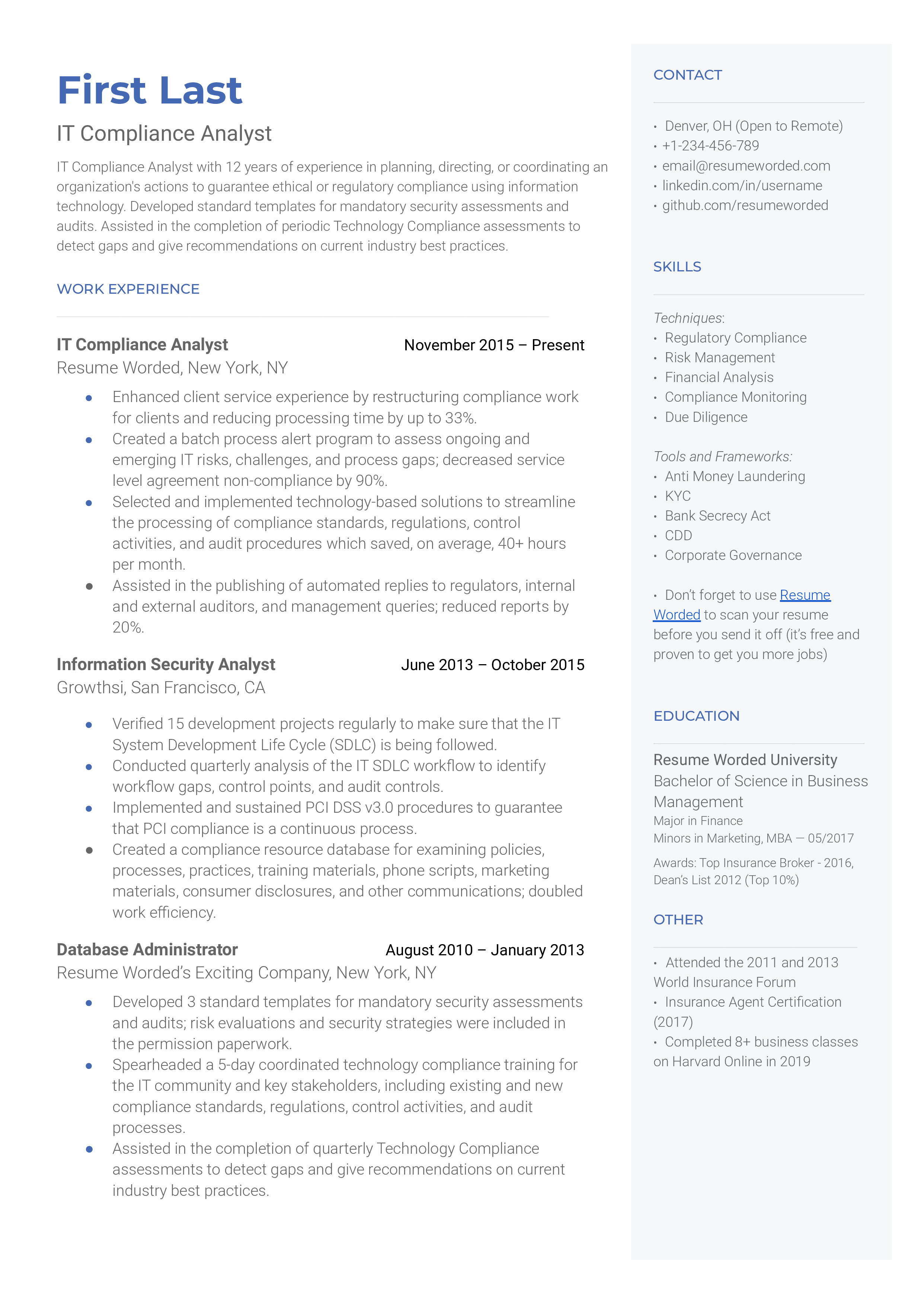 Although compliance officers may go unnoticed, they are a solid foundation for ensuring transparent processes in any business. The current demand for these professionals is great for the coming years. Therefore, if you choose this work field, we want to help you write the best resume to apply for these jobs. Take a look at the top 10 compliance resume examples below.