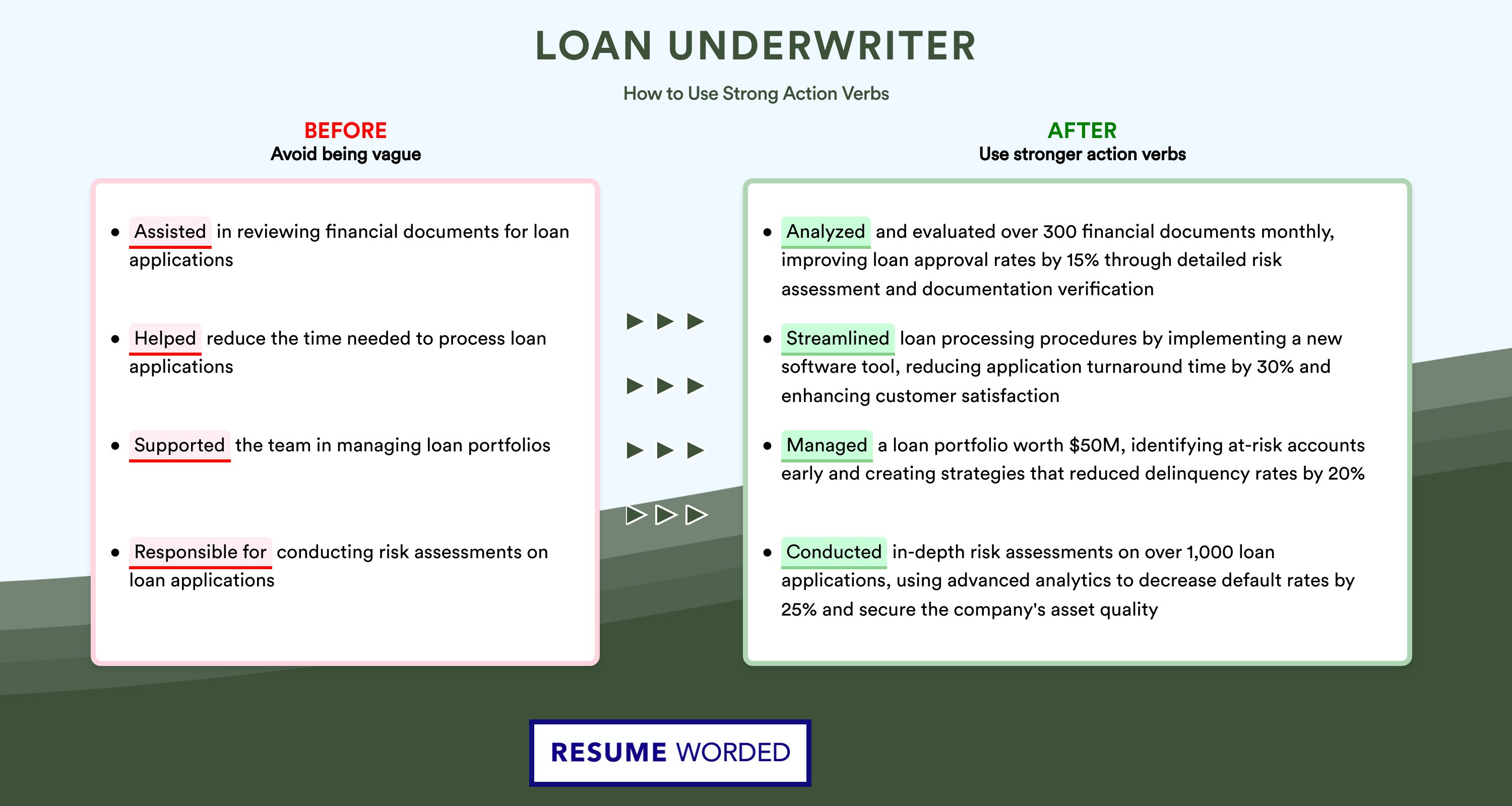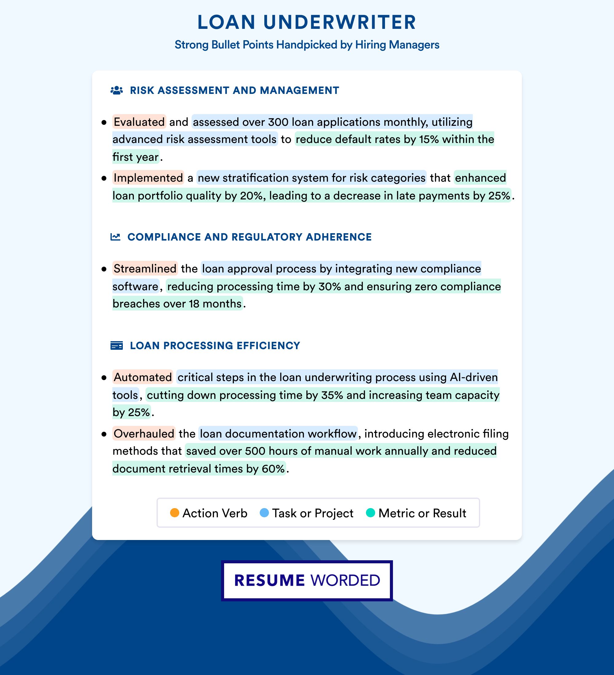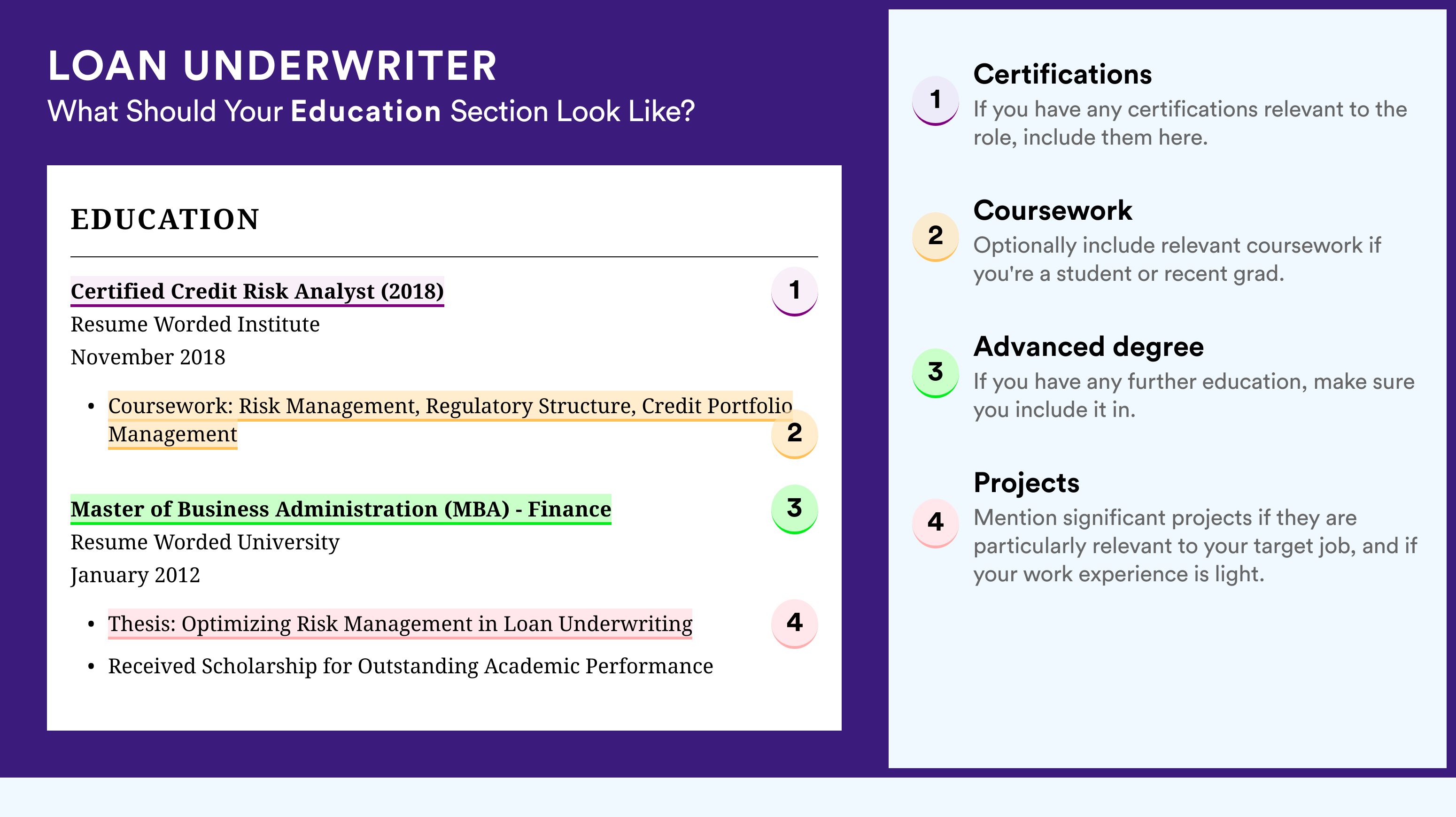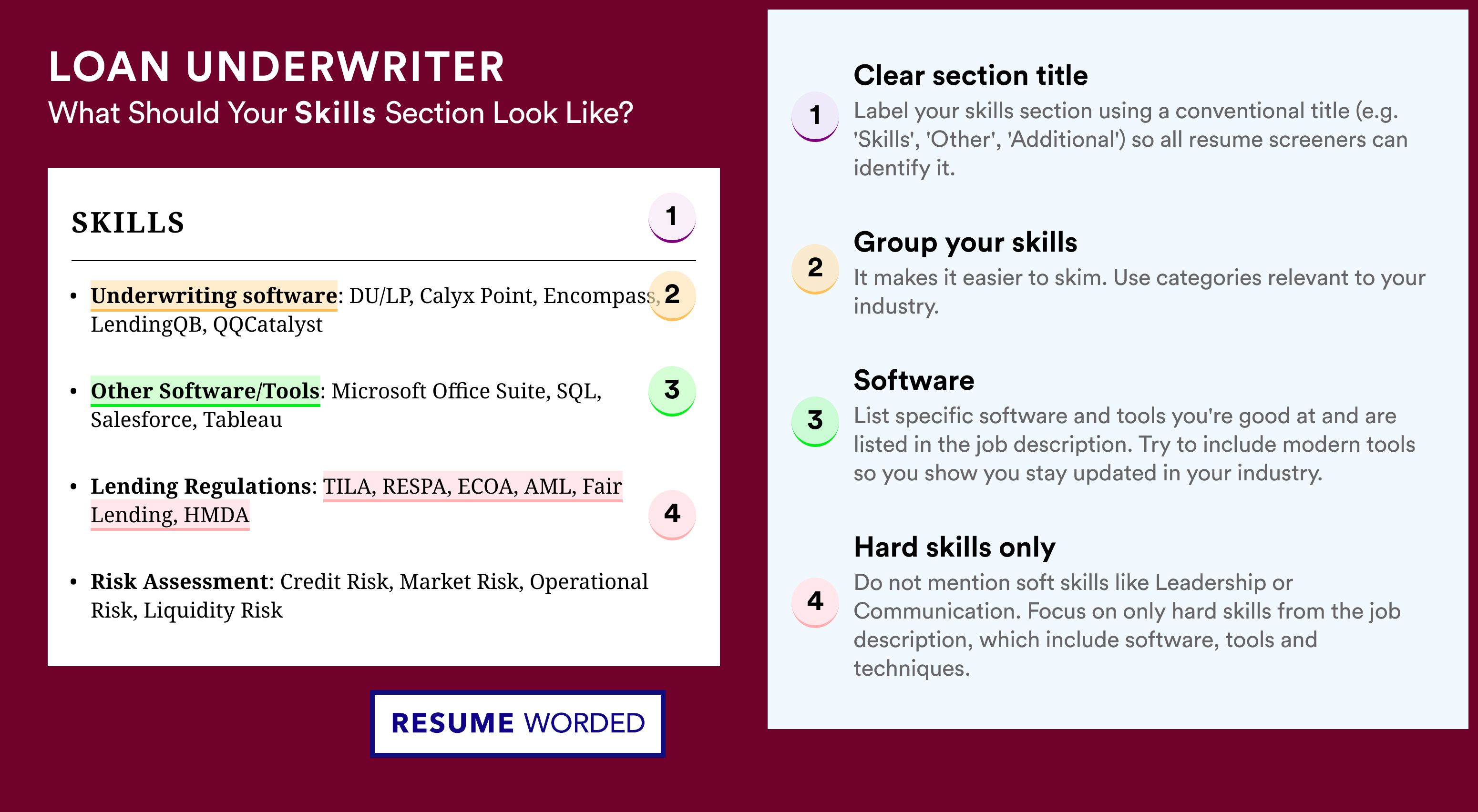 Job-specific talents should be listed in a part of a loan underwriter's resume. Once more, the hard skills—like your technical proficiency—should be the main focus of this section. In simpler words, this section is where you mention your experience in analyzing, evaluating, researching, and making decisions regarding loan applications.