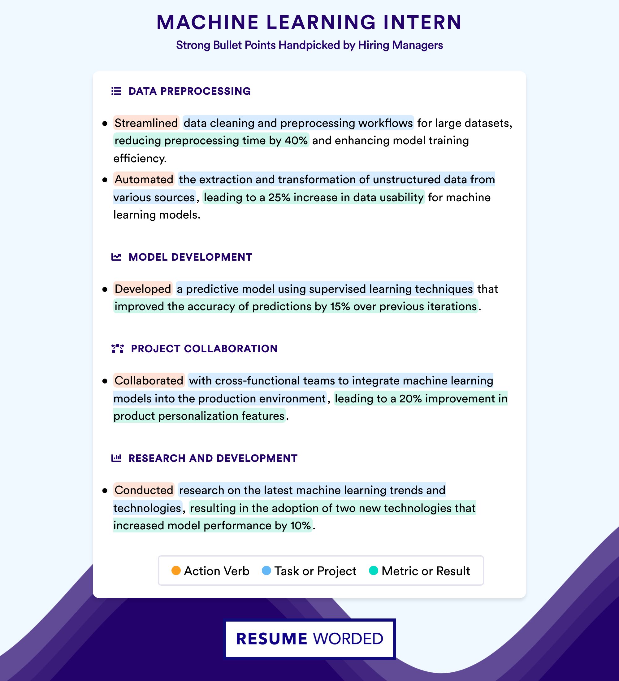Your skills section should be highly technical, so it’s important to fill it in with hard skills like the programming languages and tools in your toolkit. This will give recruiters a better idea of the type of ML systems you can build. Some of the most popular coding languages in ML are Python, Java, and C++.