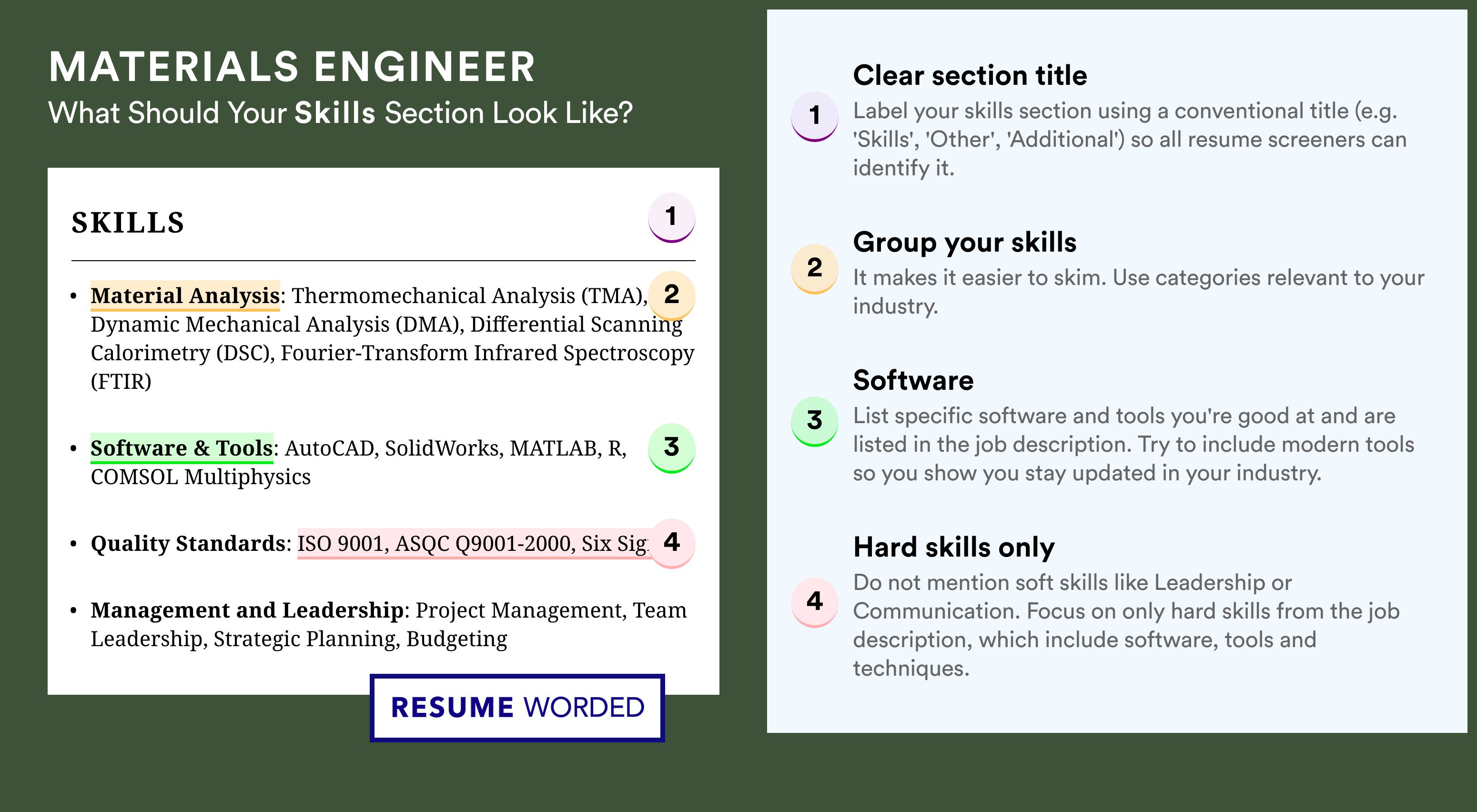 Generally, materials engineers specialize in a particular material, such as metal, plastic, or ceramic. It is essential to demonstrate this specialization on your resume since it’ll help your potential employer determine if you’re a good fit for their project.