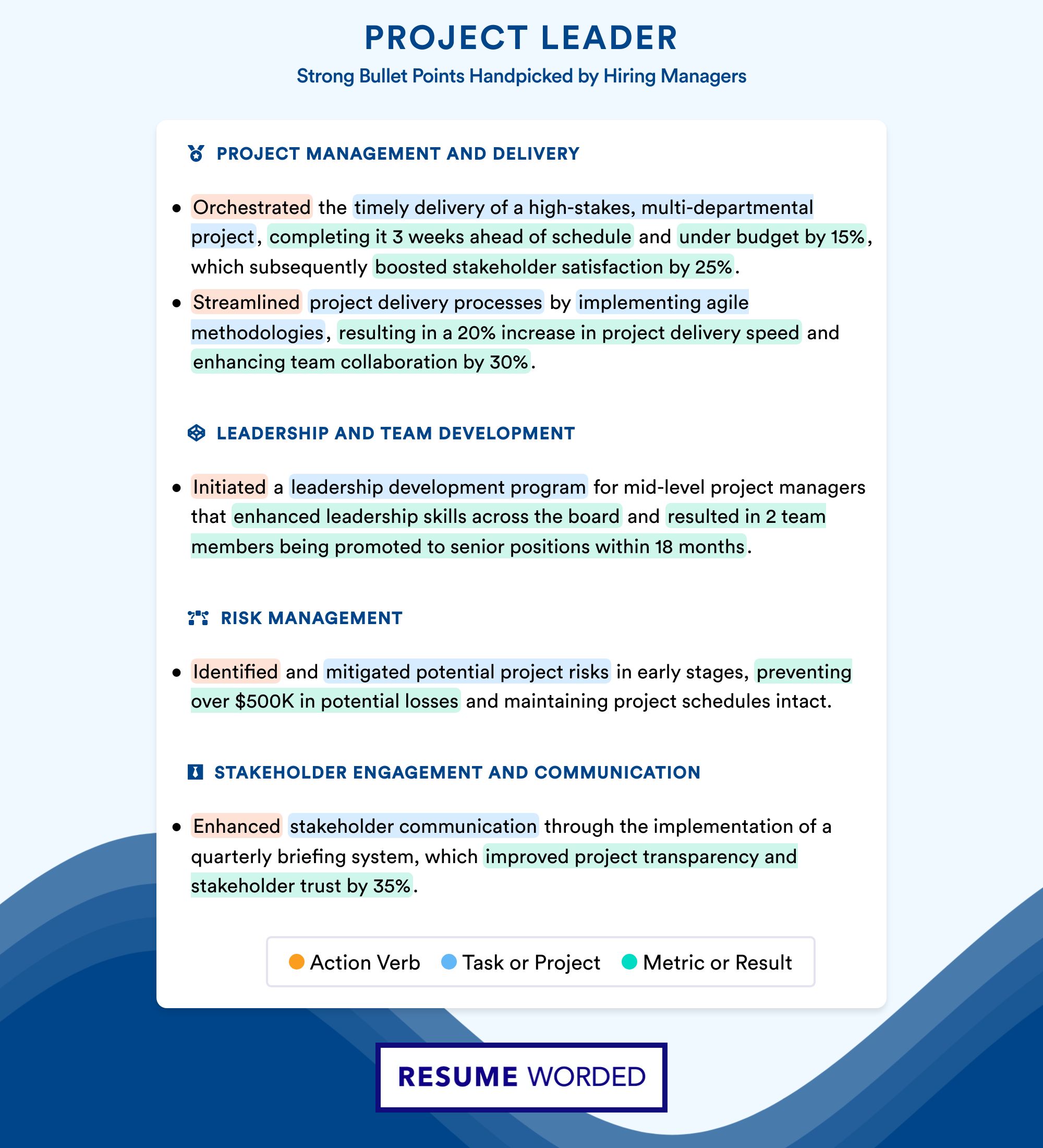 Team management should be represented across your entire resume. A high-performing project leader is able to plan strategies, oversee team members, determine schedules, and delegate tasks. You should demonstrate this to let recruiters know you are a good fit for this position.