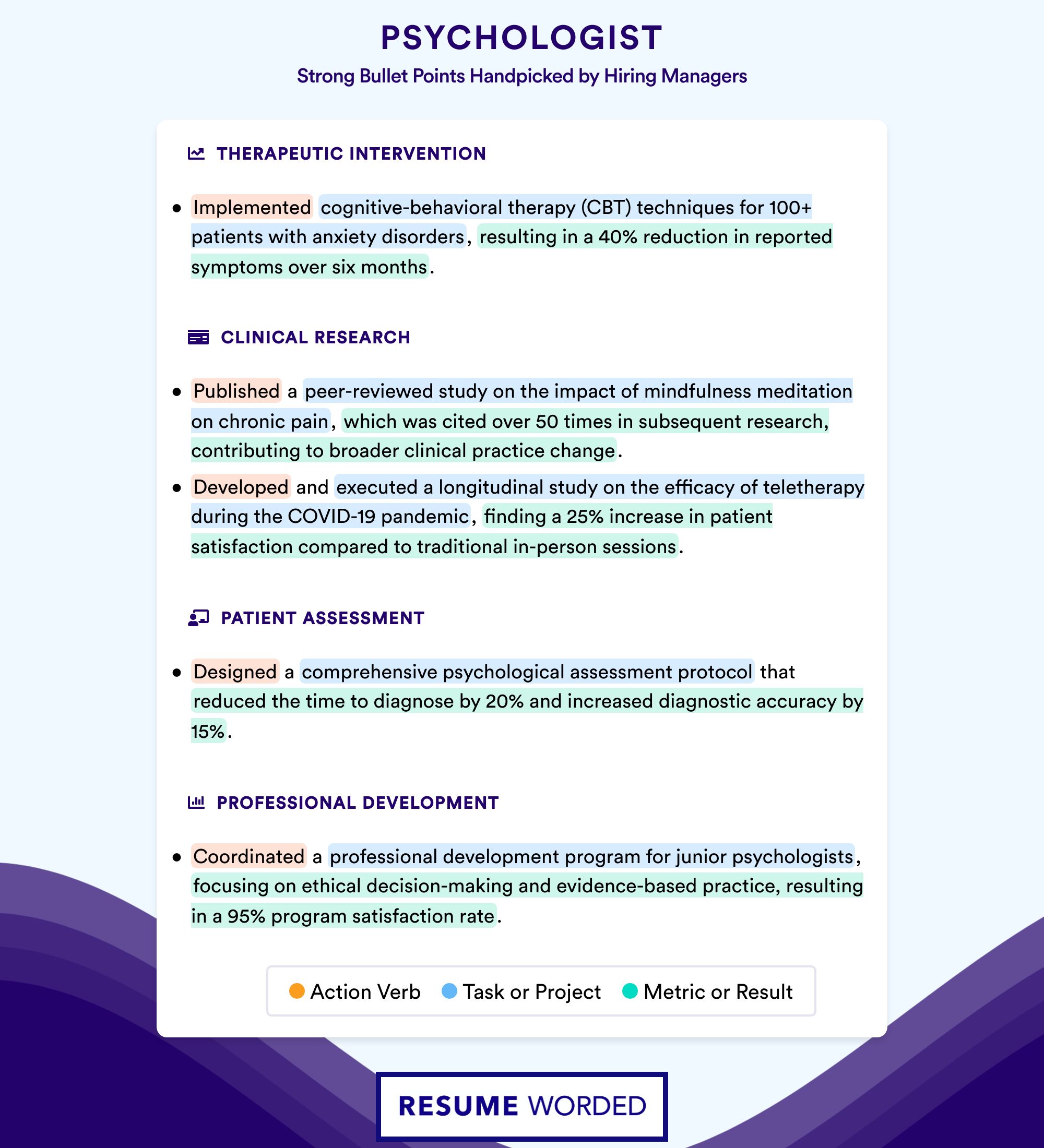 In a field as broad as psychology, it's crucial to differentiate yourself. If you've honed a particular therapeutic approach or specialize in treating certain disorders, make sure to prominently feature this in your skills section.