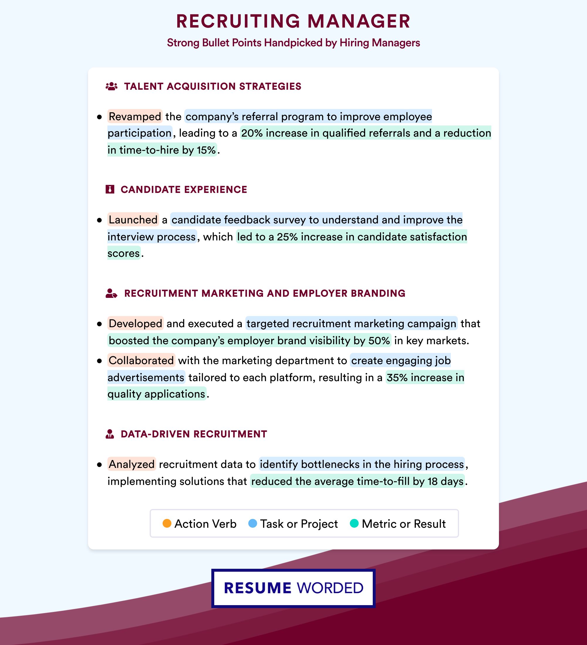 Because you are going to be managing recruiters who are working in all stages of the recruitment process, it is important that you show that you are knowledgeable and experienced with all the stages. You can indicate this in your experience section or your hard skills section as this applicant has done.