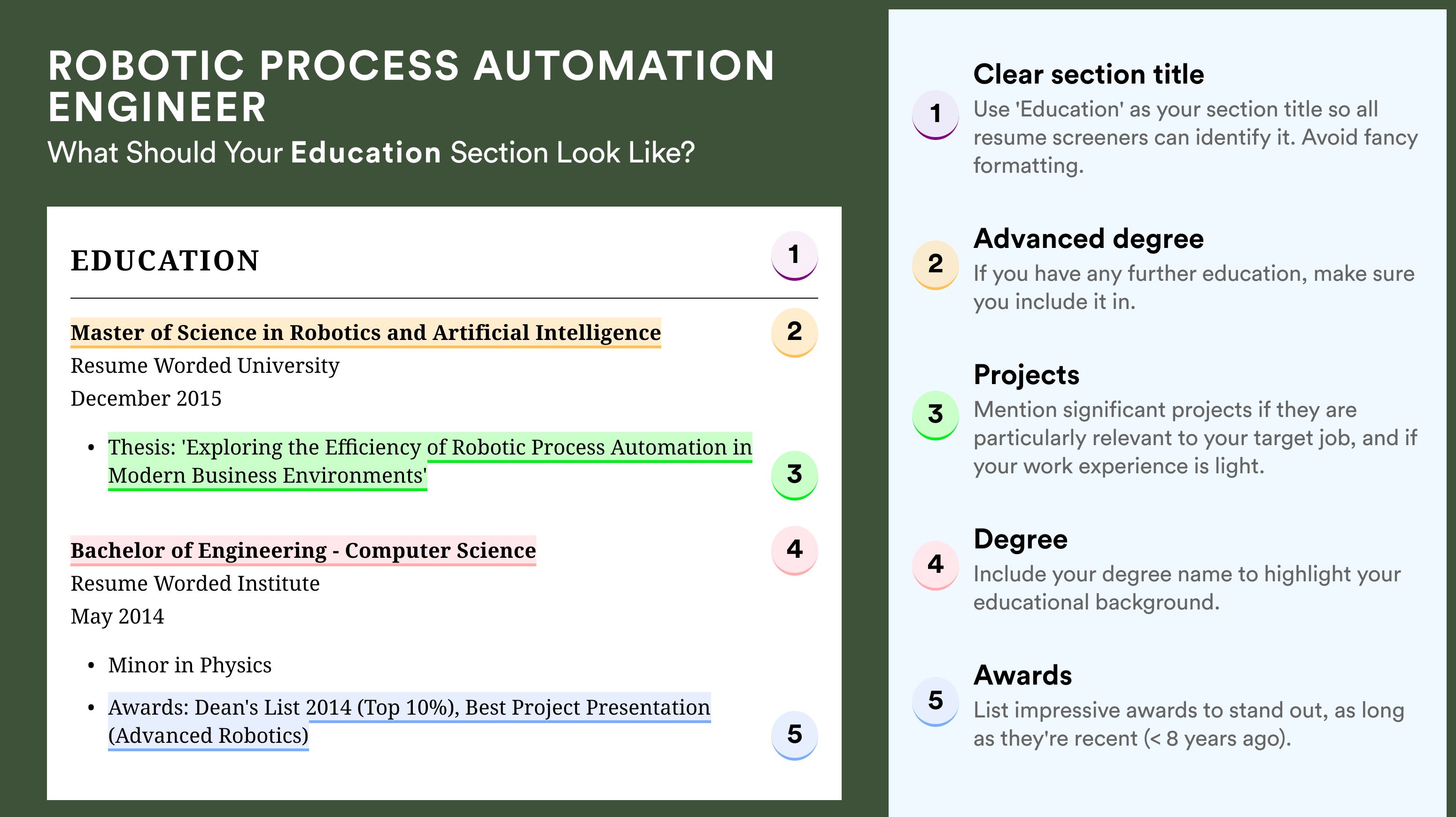 Your education section is a vital part of your robotic process automation engineer resume. It shows hiring managers that you have the necessary knowledge and training for the role. Here are some tips to help you write an effective education section: