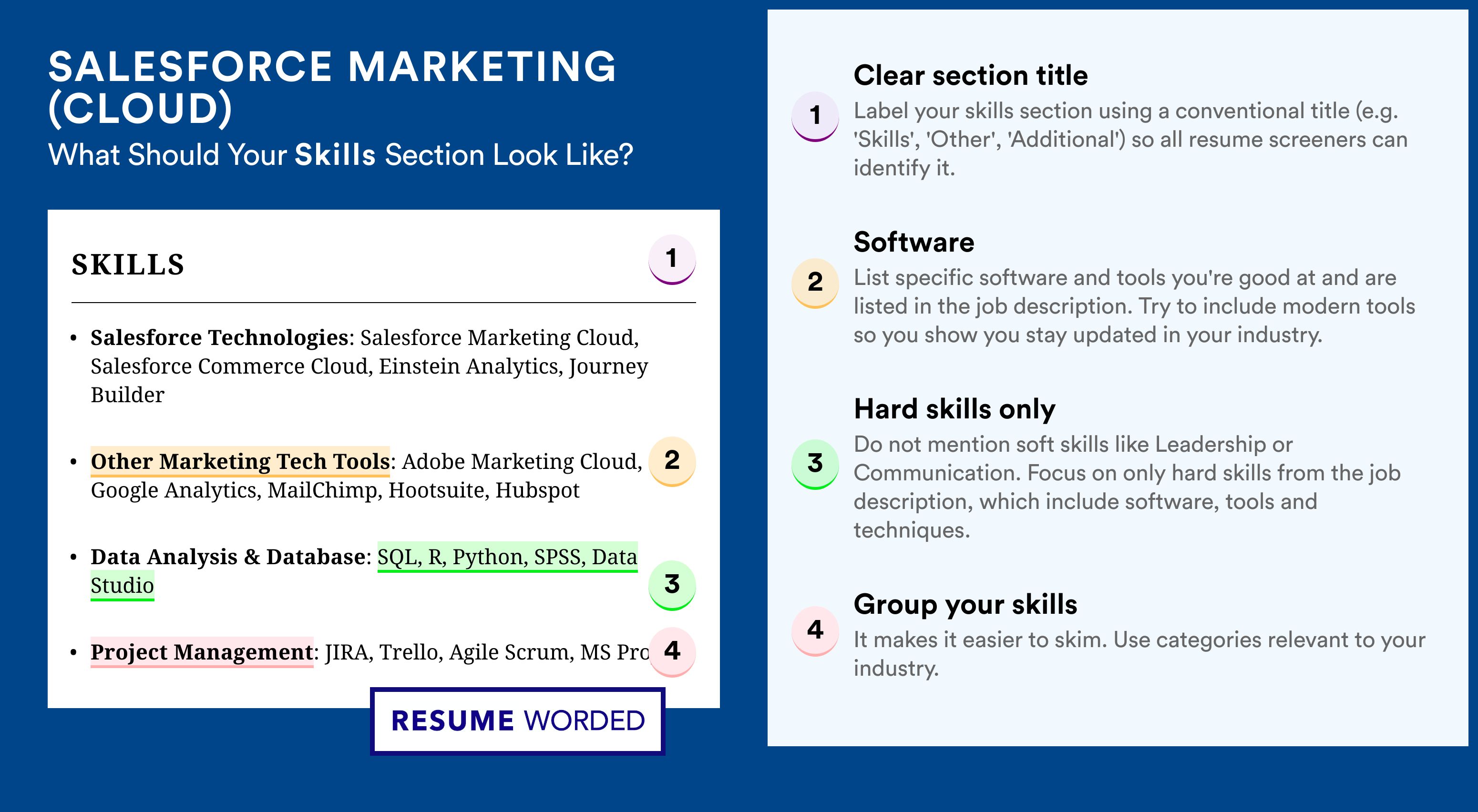 Salesforce offers several training courses and certifications for different career paths. Though Salesforce offers various marketing certifications, a certification in Salesforce marketing cloud development is best for this role. This certification gives the participant hands-on experience in developing across the entire platform. Showcasing your Salesforce credential(s) is crucial to landing this role.