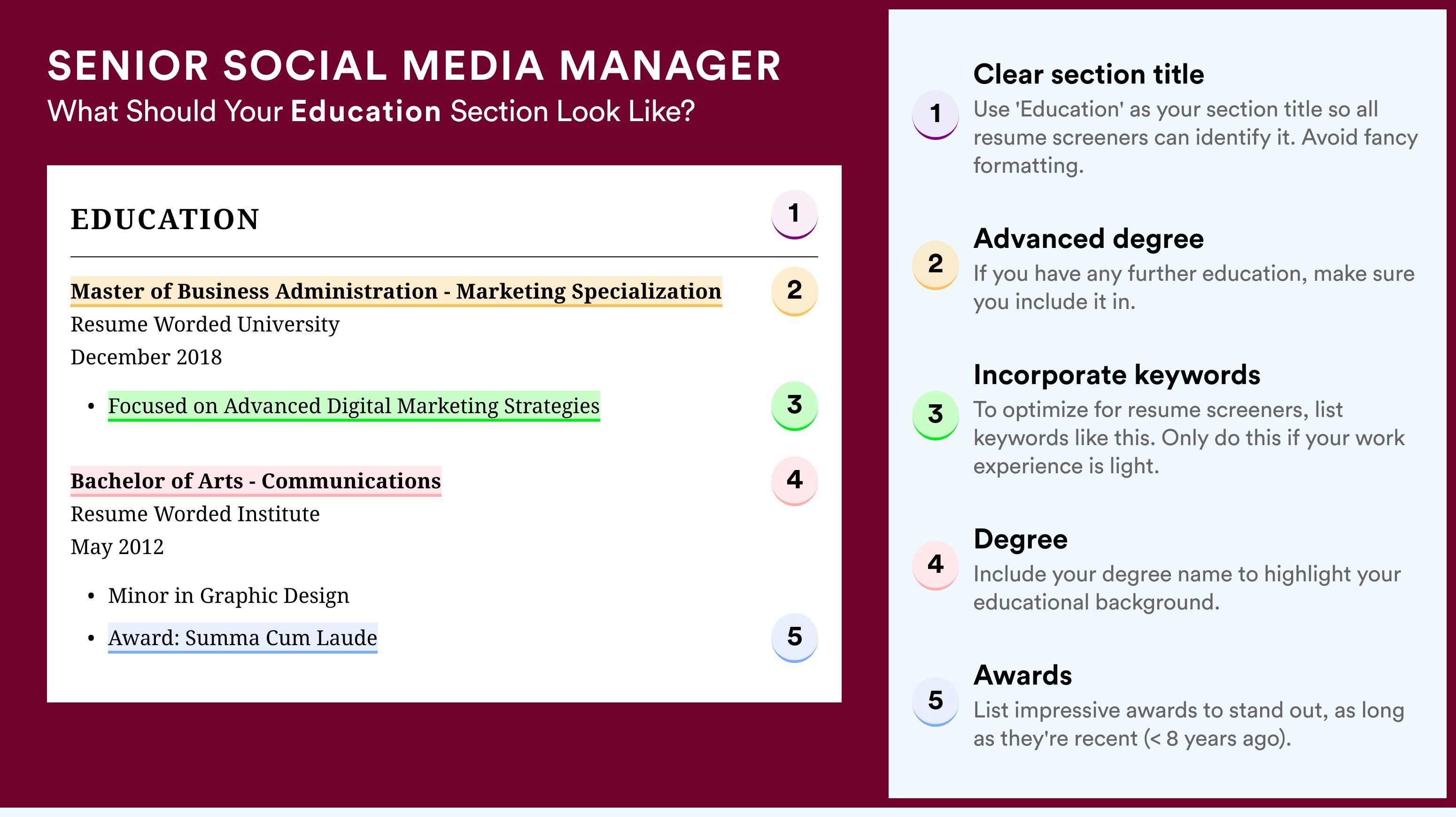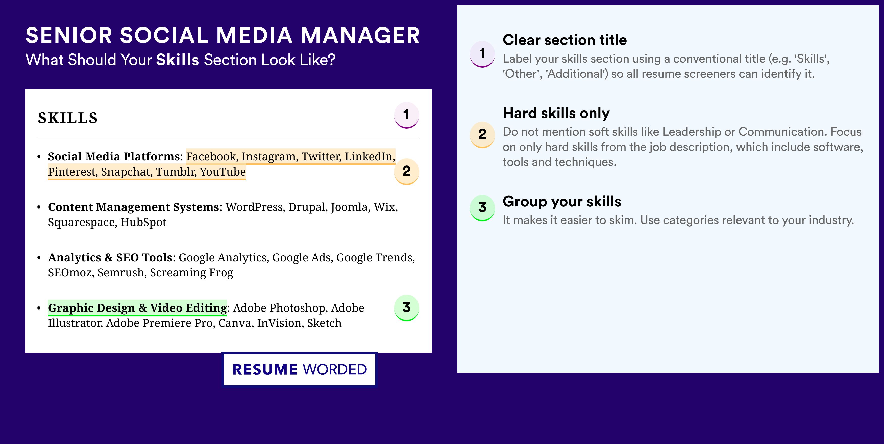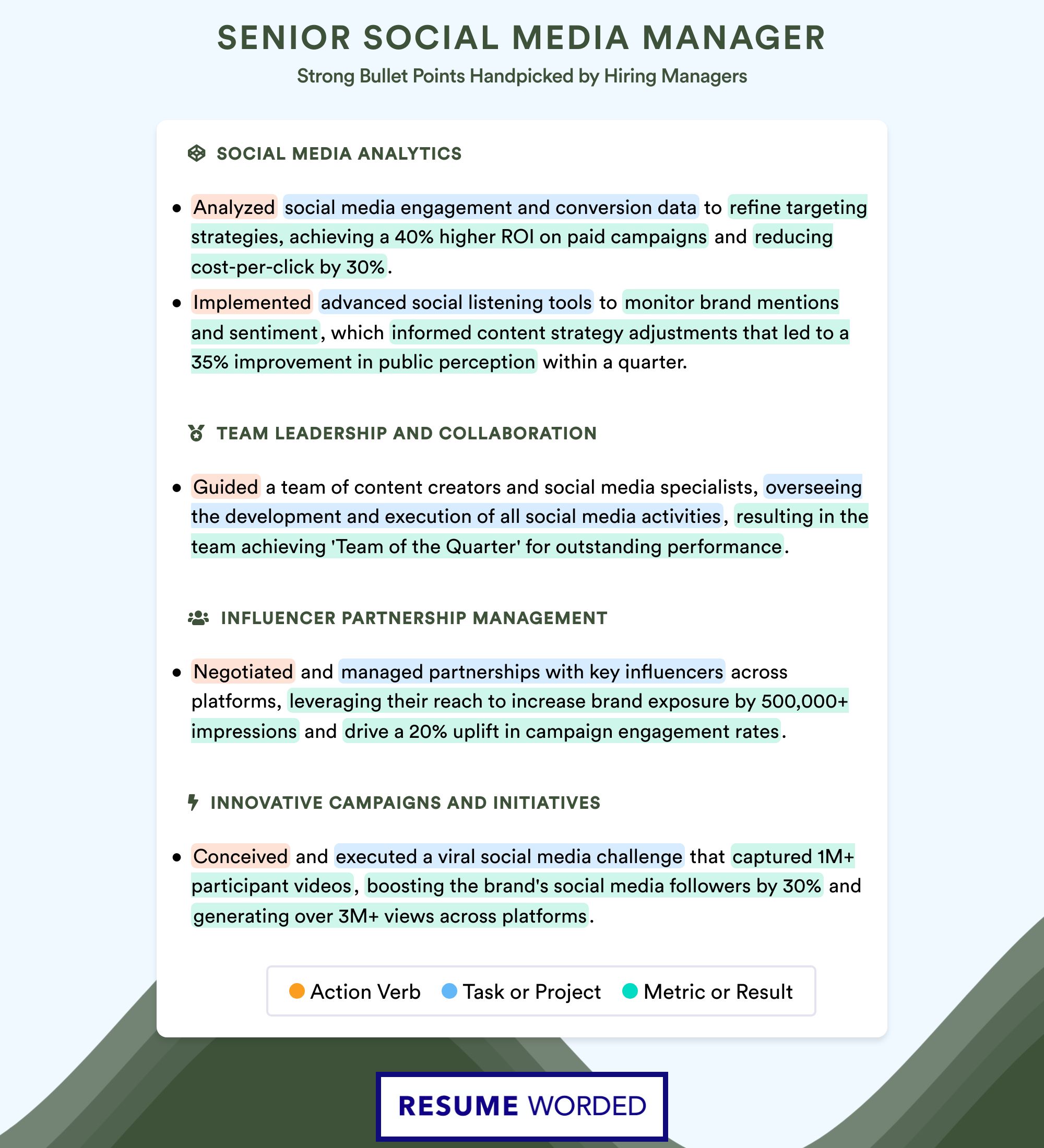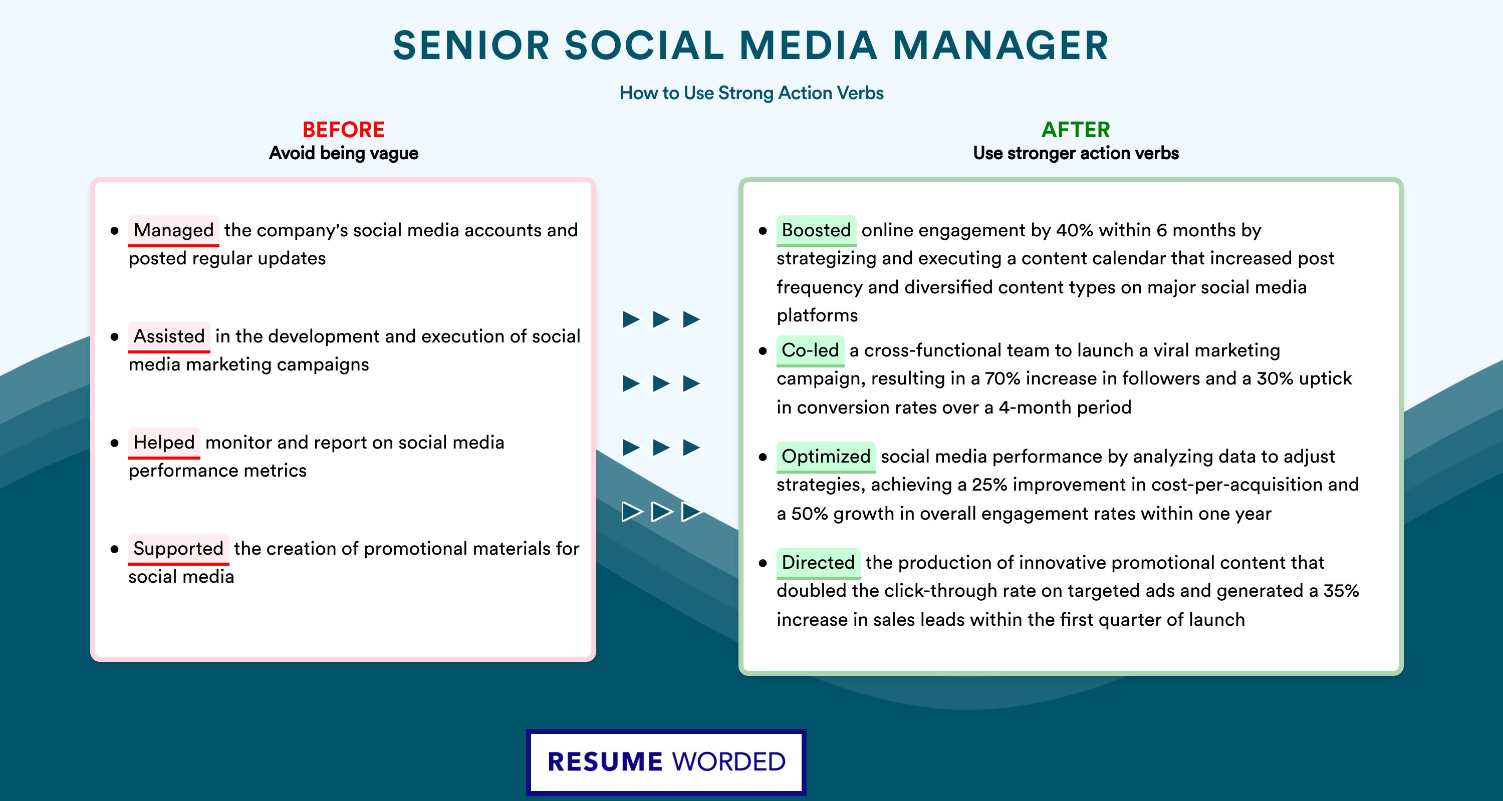 If you’re looking for a senior level role, most other applicants will have plenty of experience in the social media space, just like you. This template sets the applicant apart by focusing on select projects where their skills stand out. In this example, the template details their leadership in boosting online sales with SEO and highlights a successful product launch. When selecting project experience, we suggest you choose projects where your skills and experience align closely with key words and responsibilities outlined in the job posting.
