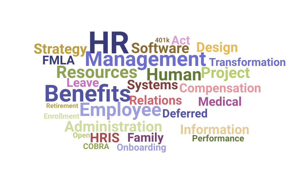 • Human Resources Benefits Manager: Benefits Administration, Employee Benefits Design, Human Resources Information Systems (HRIS), Human Resources (HR) and U.S. Family and Medical Leave Act (FMLA)