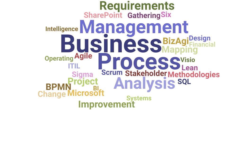 The following word cloud highlights the most popular keywords that appear on Business Process Analyst job descriptions. The bigger the word, the more frequently it shows up on employer's job postings. If you have experience with these keywords, include them on your resume.