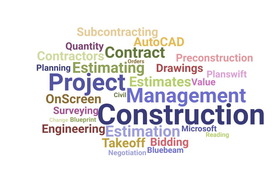 The following word cloud highlights the most popular keywords that appear on Construction Estimator job descriptions. The bigger the word, the more frequently it shows up on employer's job postings. If you have experience with these keywords, include them on your resume.