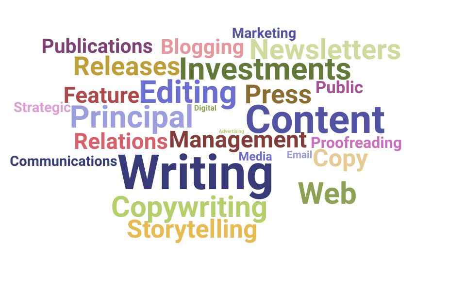 On top Marketing Communications Writer resumes, skills like Principal Investments, Web Content Writing, Copywriting, Newsletters, Writing, Press Releases, Storytelling and Copy Editing appear most often.