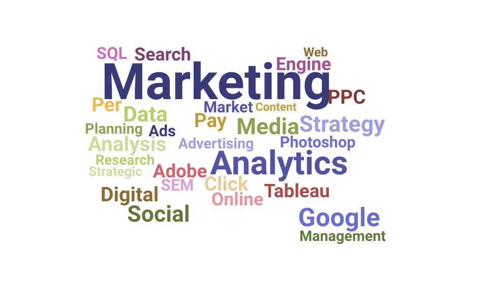 Some popular Marketing Analyst hard skills are Google Analytics, Digital Marketing, Pay Per Click (PPC), Marketing, Tableau, Data Analysis, Marketing Strategy and SQL.