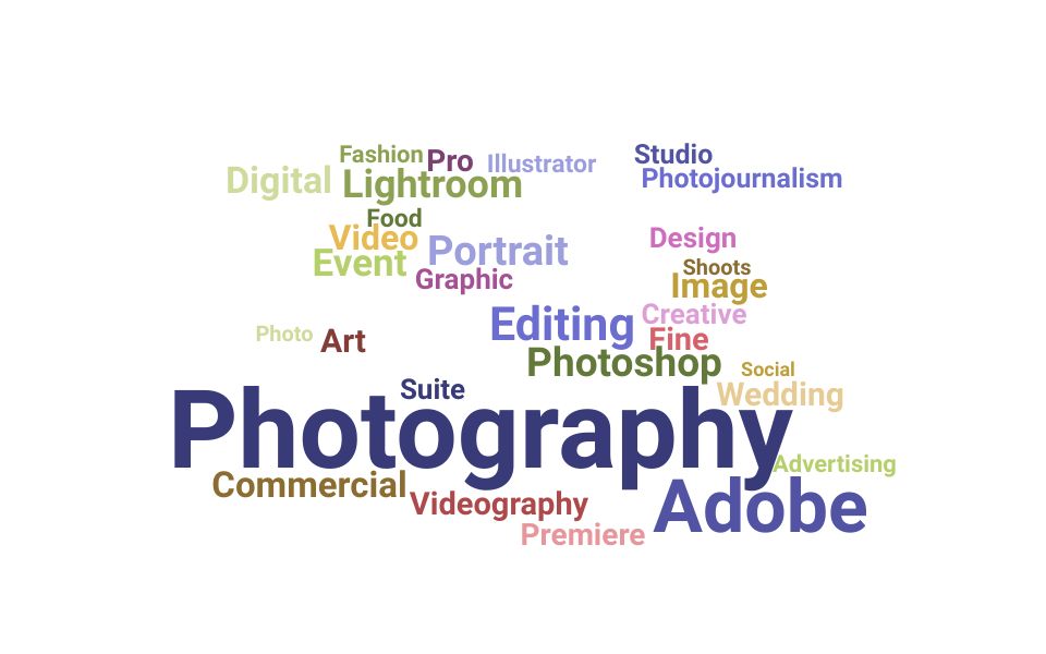The following word cloud highlights the most popular keywords that appear on Photographer job descriptions. The bigger the word, the more frequently it shows up on employer's job postings. If you have experience with these keywords, include them on your resume.
