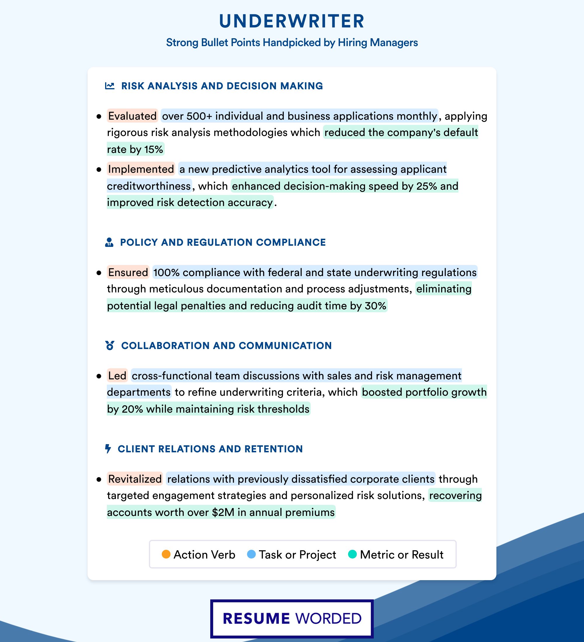 One way to impress recruiters is to show your impact in numerical figures. For example, mentioning that you improved investment performances by 25% and reduced the ratio of the fraudulent application processes by 40% will make your resume praise your analytical abilities on your behalf.